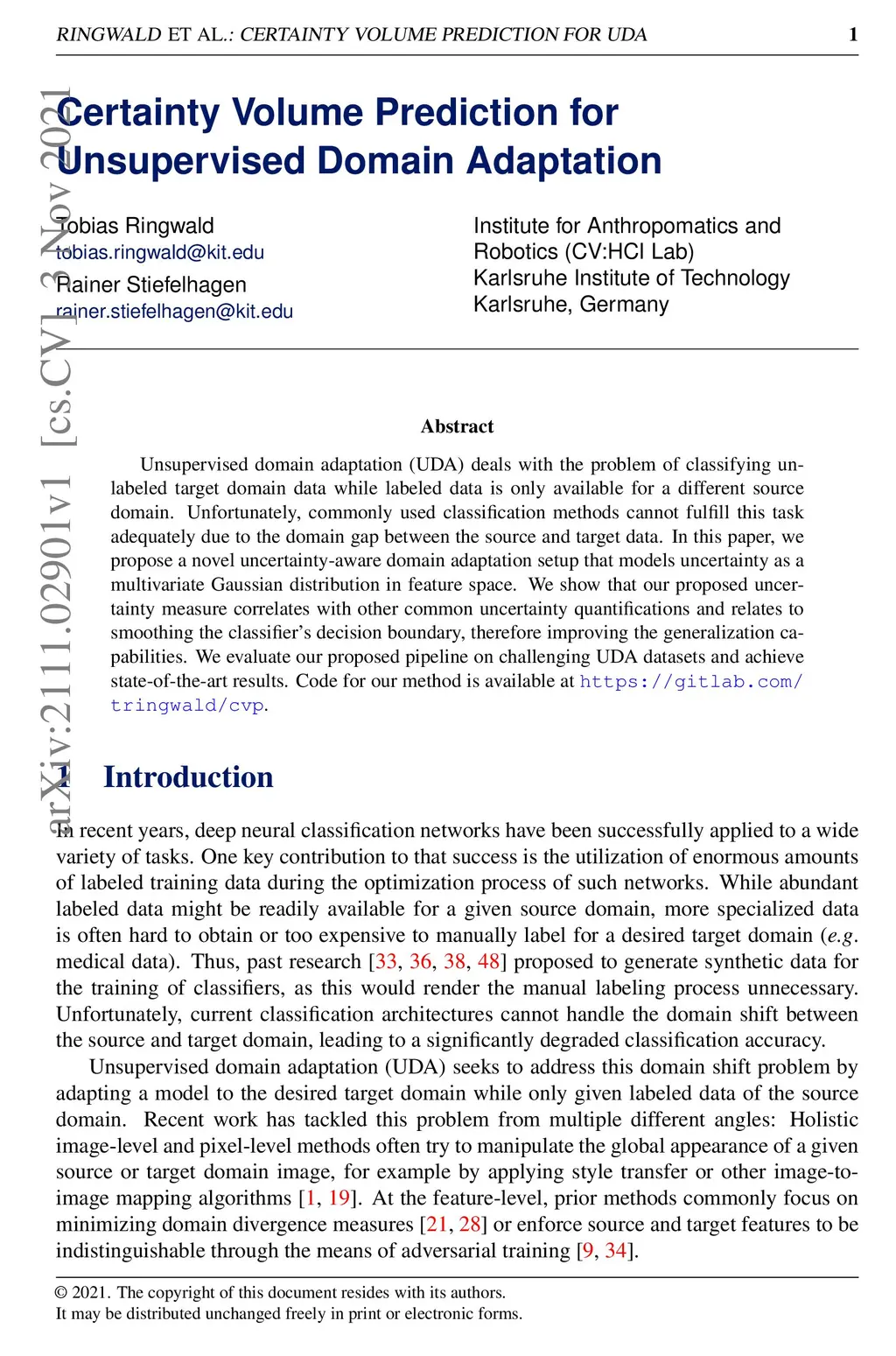 Unsupervised domain adaptation (UDA) deals with the problem of classifying unlabeled target domain data while labeled data is only available for a different source domain. Unfortunately, commonly used classification methods cannot fulfill this task adequately due to the domain gap between the source and target data. In this paper, we propose a novel uncertainty-aware domain adaptation setup that models uncertainty as a multivariate Gaussian distribution in feature space. We show that our proposed uncertainty measure correlates with other common uncertainty quantifications and relates to smoothing the classifier's decision boundary, therefore improving the generalization capabilities. We evaluate our proposed pipeline on challenging UDA datasets and achieve state-of-the-art results. Code for our method is available at https://gitlab.com/tringwald/cvp.