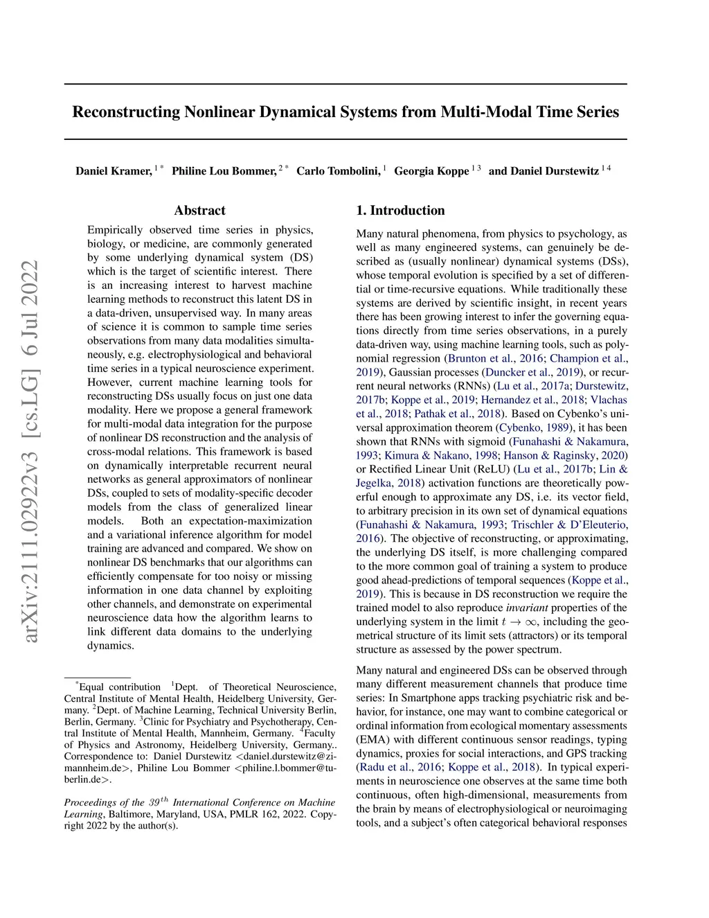 Empirically observed time series in physics, biology, or medicine, are commonly generated by some underlying dynamical system (DS) which is the target of scientific interest. There is an increasing interest to harvest machine learning methods to reconstruct this latent DS in a data-driven, unsupervised way. In many areas of science it is common to sample time series observations from many data modalities simultaneously, e.g. electrophysiological and behavioral time series in a typical neuroscience experiment. However, current machine learning tools for reconstructing DSs usually focus on just one data modality. Here we propose a general framework for multi-modal data integration for the purpose of nonlinear DS reconstruction and the analysis of cross-modal relations. This framework is based on dynamically interpretable recurrent neural networks as general approximators of nonlinear DSs, coupled to sets of modality-specific decoder models from the class of generalized linear models. Both an expectation-maximization and a variational inference algorithm for model training are advanced and compared. We show on nonlinear DS benchmarks that our algorithms can efficiently compensate for too noisy or missing information in one data channel by exploiting other channels, and demonstrate on experimental neuroscience data how the algorithm learns to link different data domains to the underlying dynamics.
