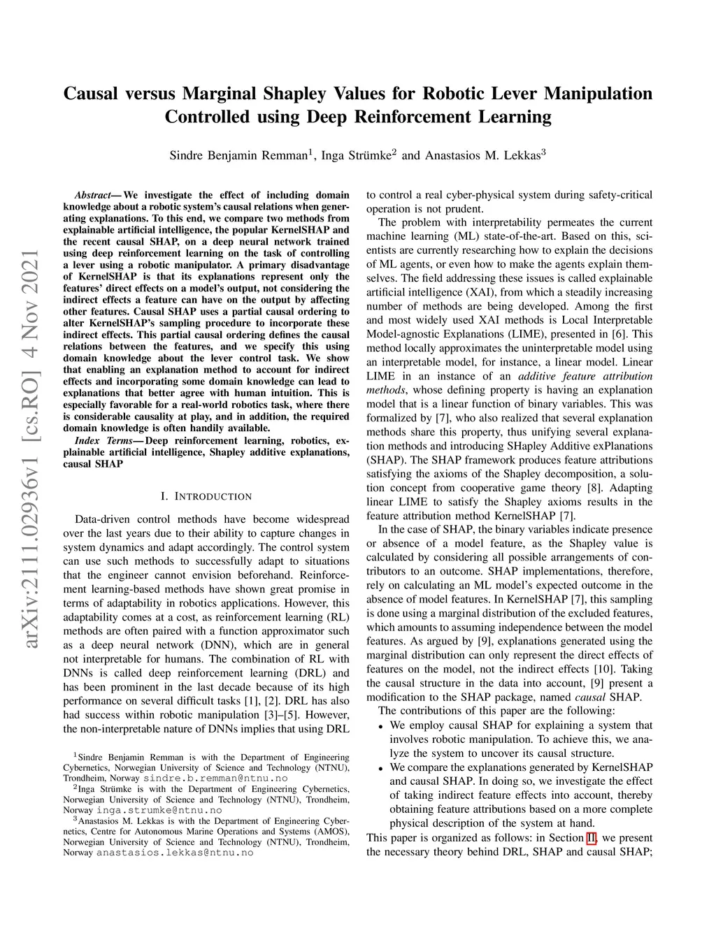Causal versus Marginal Shapley Values for Robotic Lever Manipulation