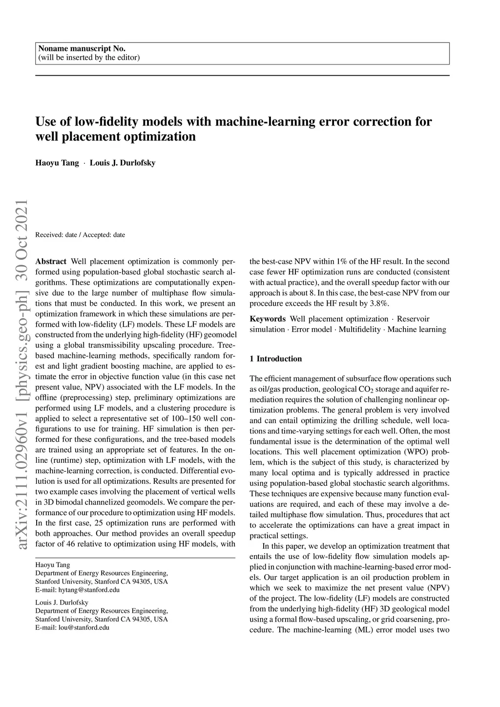 Well placement optimization is commonly performed using population-based global stochastic search algorithms. These optimizations are computationally expensive due to the large number of multiphase flow simulations that must be conducted. In this work, we present an optimization framework in which these simulations are performed with low-fidelity (LF) models. These LF models are constructed from the underlying high-fidelity (HF) geomodel using a global transmissibility upscaling procedure. Tree-based machine-learning methods, specifically random forest and light gradient boosting machine, are applied to estimate the error in objective function value (in this case net present value, NPV) associated with the LF models. In the offline (preprocessing) step, preliminary optimizations are performed using LF models, and a clustering procedure is applied to select a representative set of 100--150 well configurations to use for training. HF simulation is then performed for these configurations, and the tree-based models are trained using an appropriate set of features. In the online (runtime) step, optimization with LF models, with the machine-learning correction, is conducted. Differential evolution is used for all optimizations. Results are presented for two example cases involving the placement of vertical wells in 3D bimodal channelized geomodels. We compare the performance of our procedure to optimization using HF models. In the first case, 25 optimization runs are performed with both approaches. Our method provides an overall speedup factor of 46 relative to optimization using HF models, with the best-case NPV within 1% of the HF result. In the second case fewer HF optimization runs are conducted (consistent with actual practice), and the overall speedup factor with our approach is about 8. In this case, the best-case NPV from our procedure exceeds the HF result by 3.8%