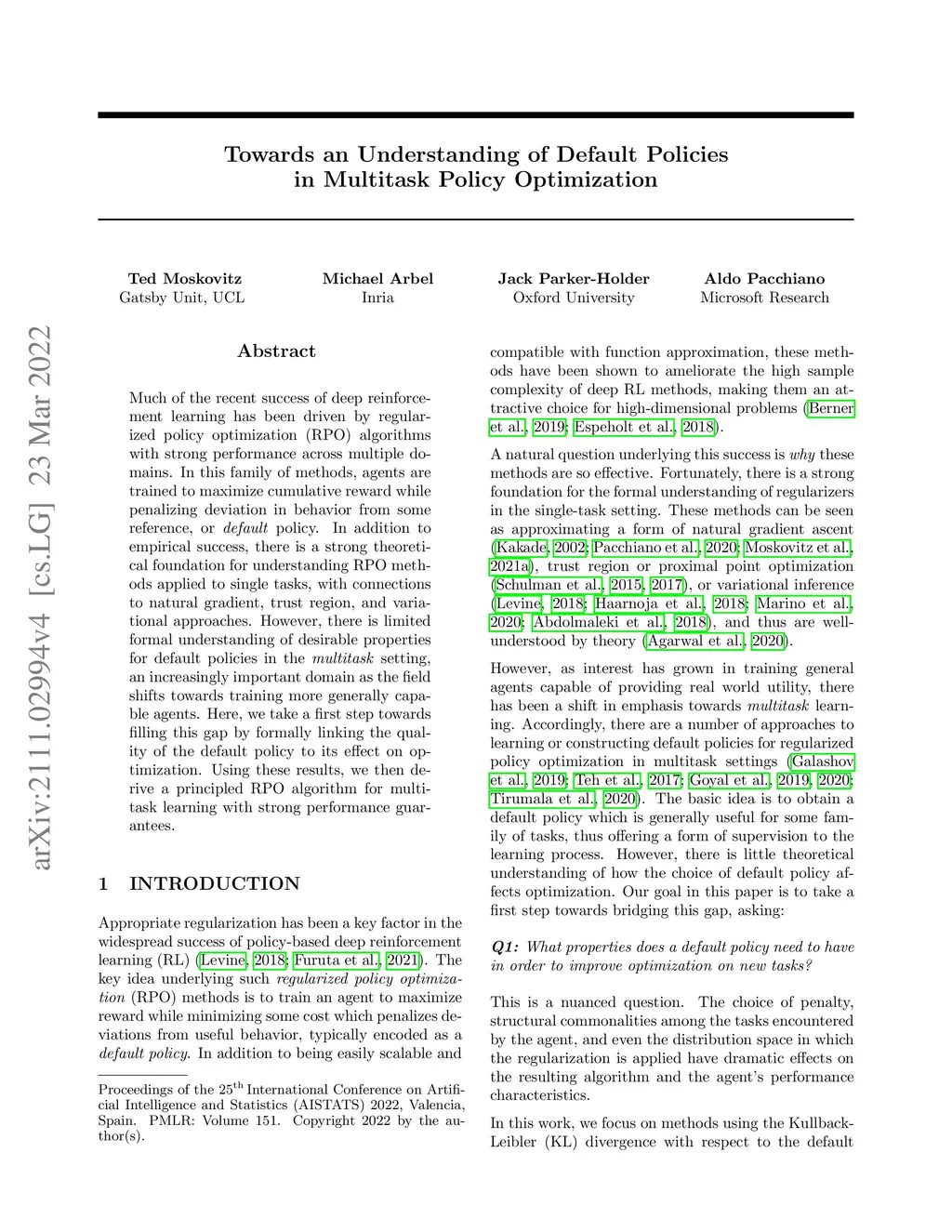 Much of the recent success of deep reinforcement learning has been driven by regularized policy optimization (RPO) algorithms with strong performance across multiple domains. In this family of methods, agents are trained to maximize cumulative reward while penalizing deviation in behavior from some reference, or default policy. In addition to empirical success, there is a strong theoretical foundation for understanding RPO methods applied to single tasks, with connections to natural gradient, trust region, and variational approaches. However, there is limited formal understanding of desirable properties for default policies in the multitask setting, an increasingly important domain as the field shifts towards training more generally capable agents. Here, we take a first step towards filling this gap by formally linking the quality of the default policy to its effect on optimization. Using these results, we then derive a principled RPO algorithm for multitask learning with strong performance guarantees.