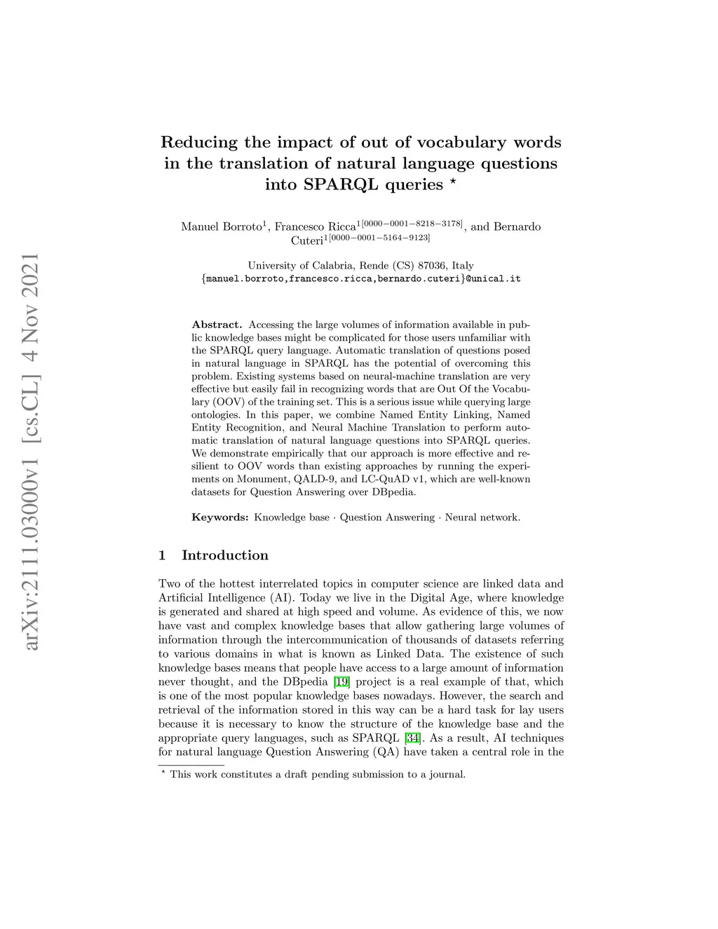 Accessing the large volumes of information available in public knowledge bases might be complicated for those users unfamiliar with the SPARQL query language. Automatic translation of questions posed in natural language in SPARQL has the potential of overcoming this problem. Existing systems based on neural-machine translation are very effective but easily fail in recognizing words that are Out Of the Vocabulary (OOV) of the training set. This is a serious issue while querying large ontologies. In this paper, we combine Named Entity Linking, Named Entity Recognition, and Neural Machine Translation to perform automatic translation of natural language questions into SPARQL queries. We demonstrate empirically that our approach is more effective and resilient to OOV words than existing approaches by running the experiments on Monument, QALD-9, and LC-QuAD v1, which are well-known datasets for Question Answering over DBpedia.