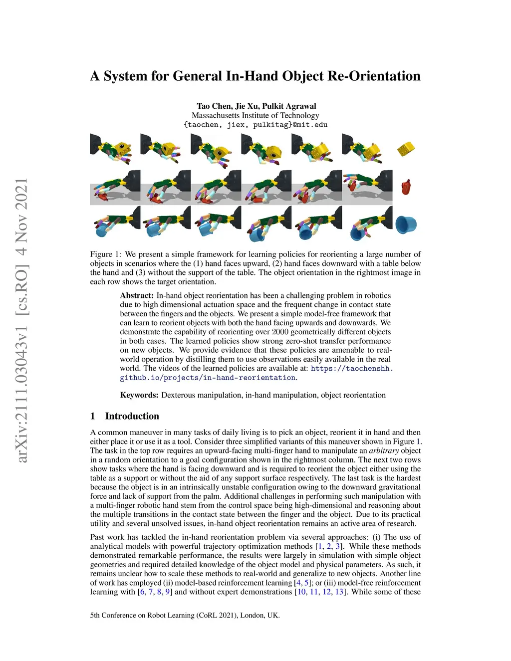 In-hand object reorientation has been a challenging problem in robotics due to high dimensional actuation space and the frequent change in contact state between the fingers and the objects. We present a simple model-free framework that can learn to reorient objects with both the hand facing upwards and downwards. We demonstrate the capability of reorienting over 2000 geometrically different objects in both cases. The learned policies show strong zero-shot transfer performance on new objects. We provide evidence that these policies are amenable to real-world operation by distilling them to use observations easily available in the real world. The videos of the learned policies are available at: https://taochenshh.github.io/projects/in-hand-reorientation.
