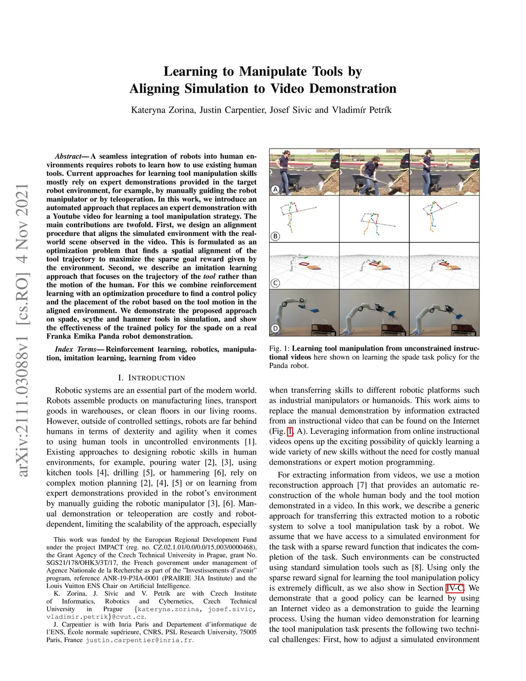 A seamless integration of robots into human environments requires robots to learn how to use existing human tools. Current approaches for learning tool manipulation skills mostly rely on expert demonstrations provided in the target robot environment, for example, by manually guiding the robot manipulator or by teleoperation. In this work, we introduce an automated approach that replaces an expert demonstration with a Youtube video for learning a tool manipulation strategy. The main contributions are twofold. First, we design an alignment procedure that aligns the simulated environment with the real-world scene observed in the video. This is formulated as an optimization problem that finds a spatial alignment of the tool trajectory to maximize the sparse goal reward given by the environment. Second, we describe an imitation learning approach that focuses on the trajectory of the tool rather than the motion of the human. For this we combine reinforcement learning with an optimization procedure to find a control policy and the placement of the robot based on the tool motion in the aligned environment. We demonstrate the proposed approach on spade, scythe and hammer tools in simulation, and show the effectiveness of the trained policy for the spade on a real Franka Emika Panda robot demonstration.
