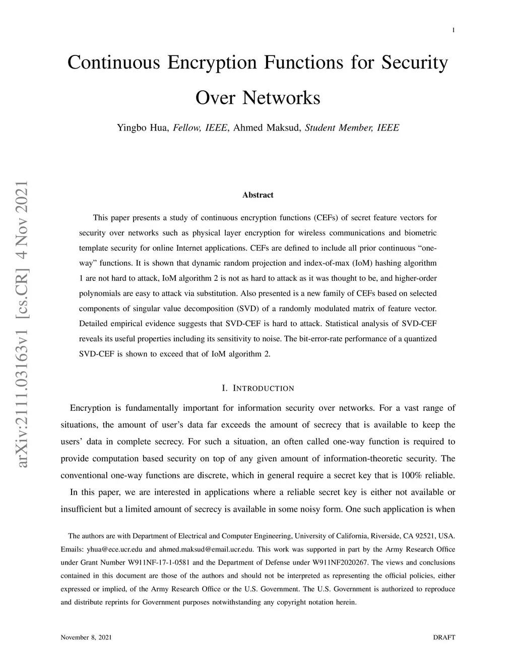 This paper presents a study of continuous encryption functions (CEFs) of secret feature vectors for security over networks such as physical layer encryption for wireless communications and biometric template security for online Internet applications. CEFs are defined to include all prior continuous "one-way" functions. It is shown that dynamic random projection and index-of-max (IoM) hashing algorithm 1 are not hard to attack, IoM algorithm 2 is not as hard to attack as it was thought to be, and higher-order polynomials are easy to attack via substitution. Also presented is a new family of CEFs based on selected components of singular value decomposition (SVD) of a randomly modulated matrix of feature vector. Detailed empirical evidence suggests that SVD-CEF is hard to attack. Statistical analysis of SVD-CEF reveals its useful properties including its sensitivity to noise. The bit-error-rate performance of a quantized SVD-CEF is shown to exceed that of IoM algorithm 2.