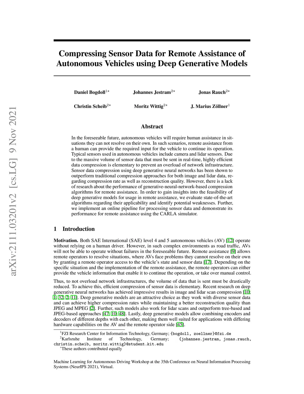 Compressing Sensor Data for Remote Assistance of Autonomous Vehicles using Deep Generative Models