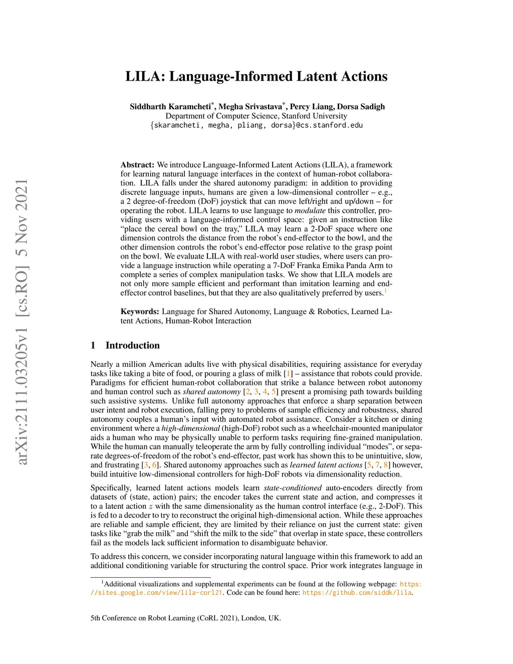 We introduce Language-Informed Latent Actions (LILA), a framework for learning natural language interfaces in the context of human-robot collaboration. LILA falls under the shared autonomy paradigm: in addition to providing discrete language inputs, humans are given a low-dimensional controller e.g., a 2 degree-of-freedom (DoF) joystick that can move left/right and up/down for operating the robot. LILA learns to use language to modulate this controller, providing users with a language-informed control space: given an instruction like "place the cereal bowl on the tray," LILA may learn a 2-DoF space where one dimension controls the distance from the robot's end-effector to the bowl, and the other dimension controls the robot's end-effector pose relative to the grasp point on the bowl. We evaluate LILA with real-world user studies, where users can provide a language instruction while operating a 7-DoF Franka Emika Panda Arm to complete a series of complex manipulation tasks. We show that LILA models are not only more sample efficient and performant than imitation learning and end-effector control baselines, but that they are also qualitatively preferred by users.