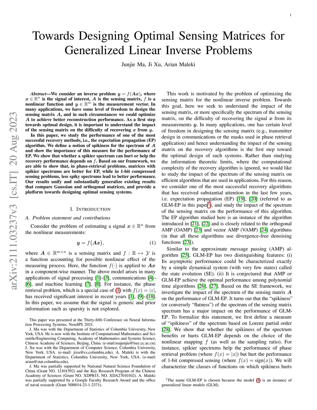 We consider a nonlinear inverse problem , where observations are the componentwise nonlinear transformation of , is the signal of interest and is a known linear mapping. By properly specifying the nonlinear processing function, this model can be particularized to many signal processing problems, including compressed sensing and phase retrieval. Our main goal in this paper is to understand the impact of sensing matrices, or more specifically the spectrum of sensing matrices, on the difficulty of recovering from . Towards this goal, we study the performance of one of the most successful recovery methods, i.e. the expectation propagation algorithm (EP). We define a notion for the spikiness of the spectrum of and show the importance of this measure in the performance of the EP. Whether the spikiness of the spectrum can hurt or help the recovery performance of EP depends on . We define certain quantities based on the function that enables us to describe the impact of the spikiness of the spectrum on EP recovery. Based on our framework, we are able to show that for instance, in phase-retrieval problems, matrices with spikier spectrums are better for EP, while in 1-bit compressed sensing problems, less spiky (flatter) spectrums offer better recoveries. Our results unify and substantially generalize the existing results that compare sub-Gaussian and orthogonal matrices, and provide a platform toward designing optimal sensing systems.