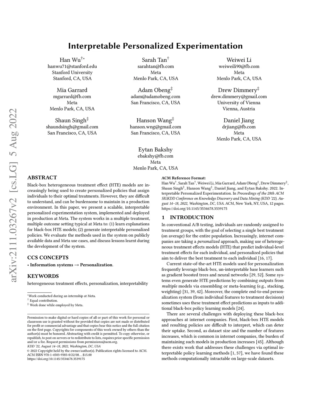 Black-box heterogeneous treatment effect (HTE) models are increasingly being used to create personalized policies that assign individuals to their optimal treatments. However, they are difficult to understand, and can be burdensome to maintain in a production environment. In this paper, we present a scalable, interpretable personalized experimentation system, implemented and deployed in production at Meta. The system works in a multiple treatment, multiple outcome setting typical at Meta to: (1) learn explanations for black-box HTE models; (2) generate interpretable personalized policies. We evaluate the methods used in the system on publicly available data and Meta use cases, and discuss lessons learnt during the development of the system.