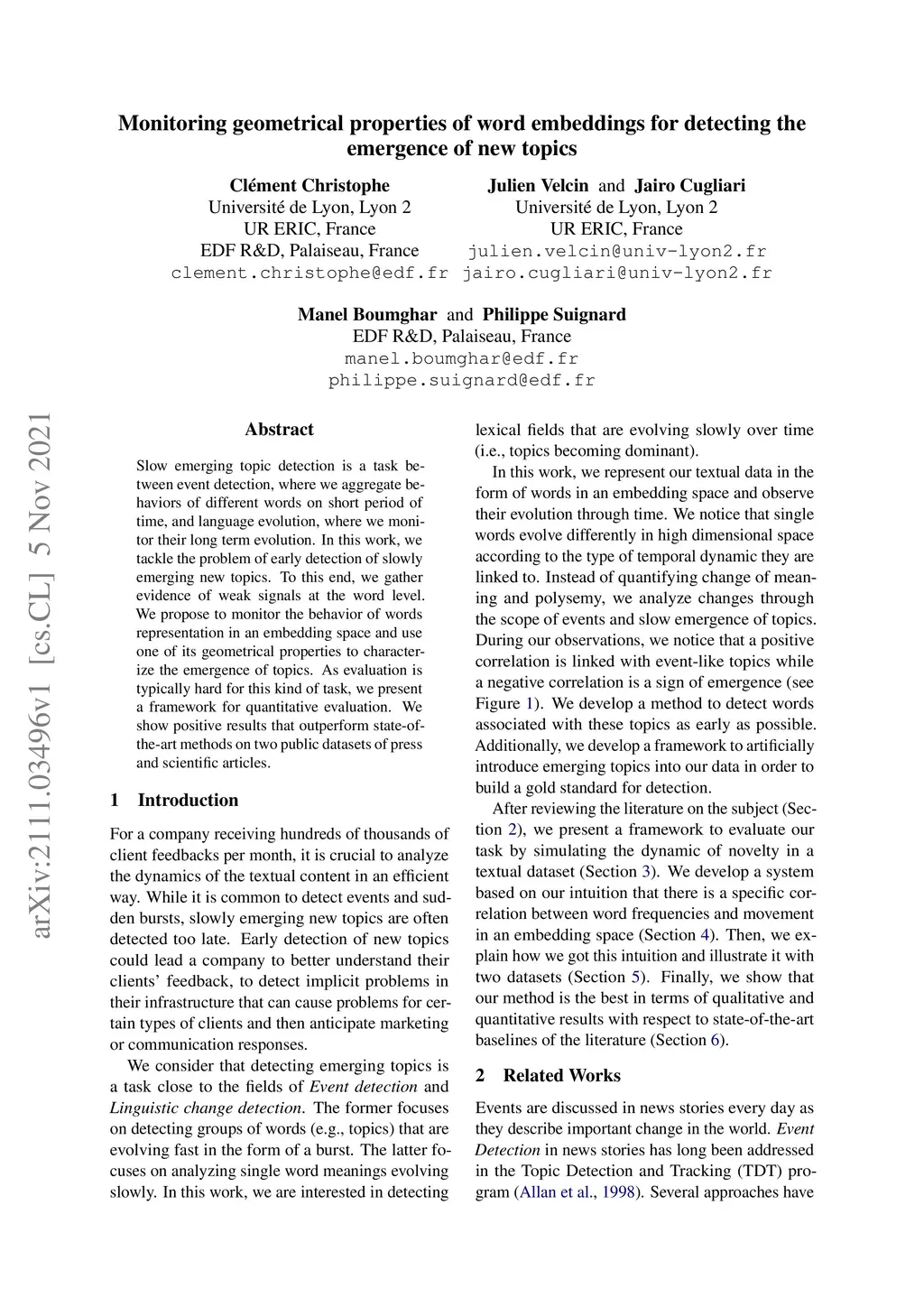 Slow emerging topic detection is a task between event detection, where we aggregate behaviors of different words on short period of time, and language evolution, where we monitor their long term evolution. In this work, we tackle the problem of early detection of slowly emerging new topics. To this end, we gather evidence of weak signals at the word level. We propose to monitor the behavior of words representation in an embedding space and use one of its geometrical properties to characterize the emergence of topics. As evaluation is typically hard for this kind of task, we present a framework for quantitative evaluation. We show positive results that outperform state-of-the-art methods on two public datasets of press and scientific articles.