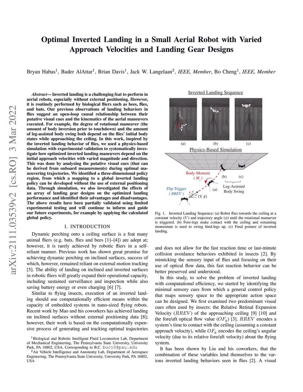 Inverted landing is a challenging feat to perform in aerial robots, especially without external positioning. However, it is routinely performed by biological fliers such as bees, flies, and bats. Our previous observations of landing behaviors in flies suggest an open-loop causal relationship between their putative visual cues and the kinematics of the aerial maneuvers executed. For example, the degree of rotational maneuver (therefore the body inversion prior to touchdown) and the amount of leg-assisted body swing both depend on the flies' initial body states while approaching the ceiling. In this work, by using a physics-based simulation with experimental validation, we systematically investigated how optimized inverted landing maneuvers depend on the initial approach velocities with varied magnitude and direction. This was done by analyzing the putative visual cues (that can be derived from onboard measurements) during optimal maneuvering trajectories. We identified a three-dimensional policy region, from which a mapping to a global inverted landing policy can be developed without the use of external positioning data. In addition, we also investigated the effects of an array of landing gear designs on the optimized landing performance and identified their advantages and disadvantages. The above results have been partially validated using limited experimental testing and will continue to inform and guide our future experiments, for example by applying the calculated global policy.