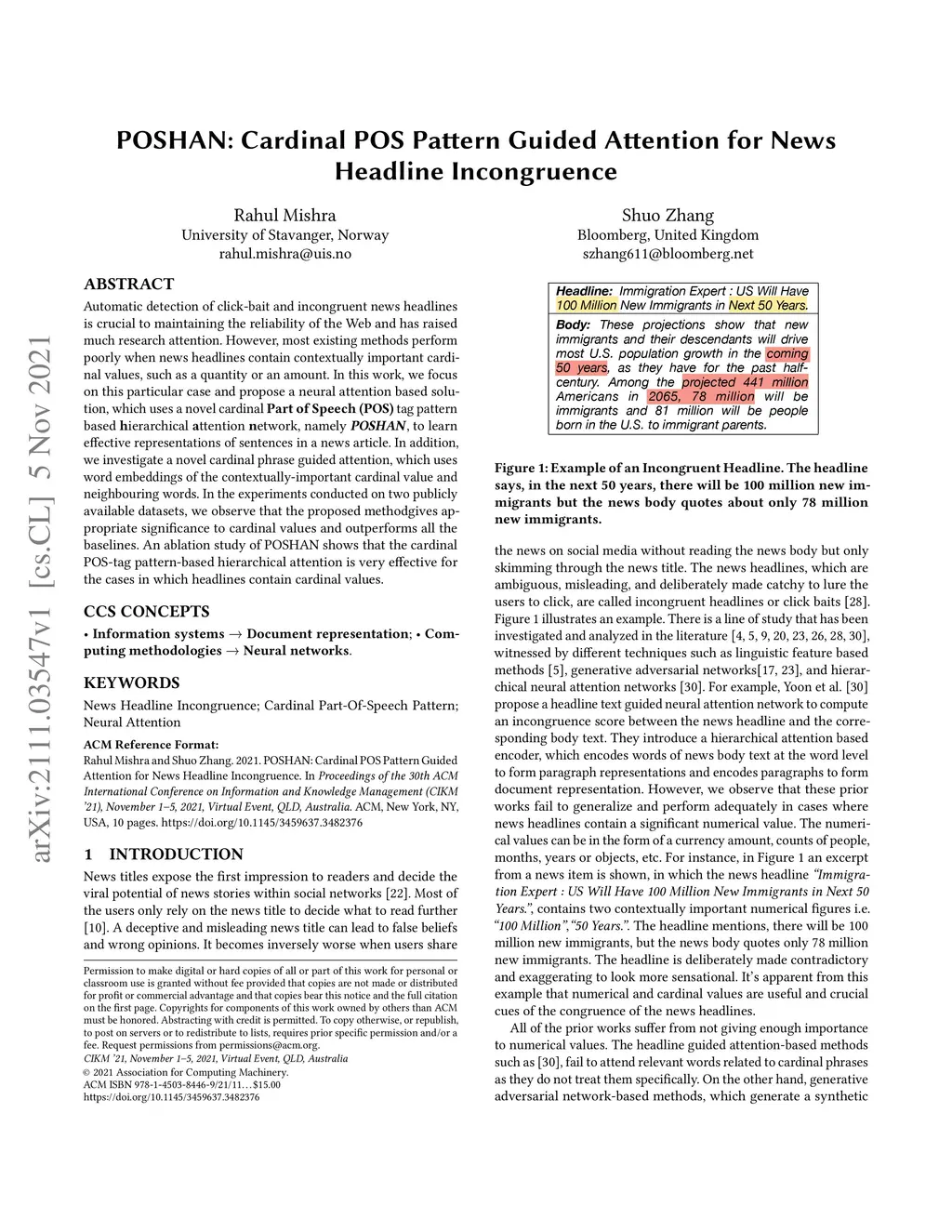 Automatic detection of click-bait and incongruent news headlines is crucial to maintaining the reliability of the Web and has raised much research attention. However, most existing methods perform poorly when news headlines contain contextually important cardinal values, such as a quantity or an amount. In this work, we focus on this particular case and propose a neural attention based solution, which uses a novel cardinal Part of Speech (POS) tag pattern based hierarchical attention network, namely POSHAN, to learn effective representations of sentences in a news article. In addition, we investigate a novel cardinal phrase guided attention, which uses word embeddings of the contextually-important cardinal value and neighbouring words. In the experiments conducted on two publicly available datasets, we observe that the proposed methodgives appropriate significance to cardinal values and outperforms all the baselines. An ablation study of POSHAN shows that the cardinal POS-tag pattern-based hierarchical attention is very effective for the cases in which headlines contain cardinal values.