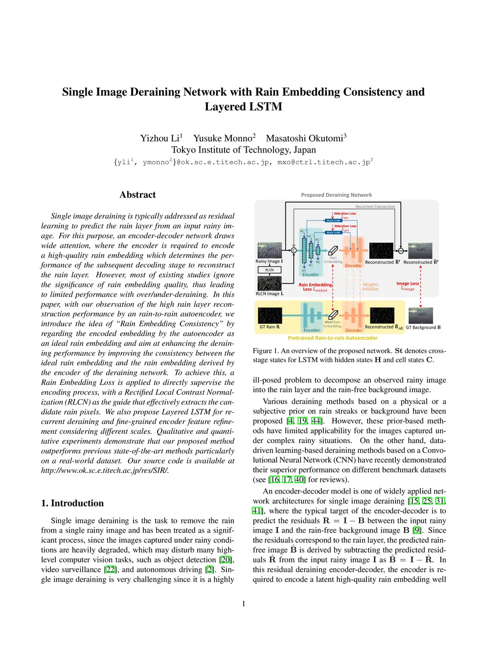 Single image deraining is typically addressed as residual learning to predict the rain layer from an input rainy image. For this purpose, an encoder-decoder network draws wide attention, where the encoder is required to encode a high-quality rain embedding which determines the performance of the subsequent decoding stage to reconstruct the rain layer. However, most of existing studies ignore the significance of rain embedding quality, thus leading to limited performance with over/under-deraining. In this paper, with our observation of the high rain layer reconstruction performance by an rain-to-rain autoencoder, we introduce the idea of "Rain Embedding Consistency" by regarding the encoded embedding by the autoencoder as an ideal rain embedding and aim at enhancing the deraining performance by improving the consistency between the ideal rain embedding and the rain embedding derived by the encoder of the deraining network. To achieve this, a Rain Embedding Loss is applied to directly supervise the encoding process, with a Rectified Local Contrast Normalization (RLCN) as the guide that effectively extracts the candidate rain pixels. We also propose Layered LSTM for recurrent deraining and fine-grained encoder feature refinement considering different scales. Qualitative and quantitative experiments demonstrate that our proposed method outperforms previous state-of-the-art methods particularly on a real-world dataset. Our source code is available at http://www.ok.sc.e.titech.ac.jp/res/SIR/.