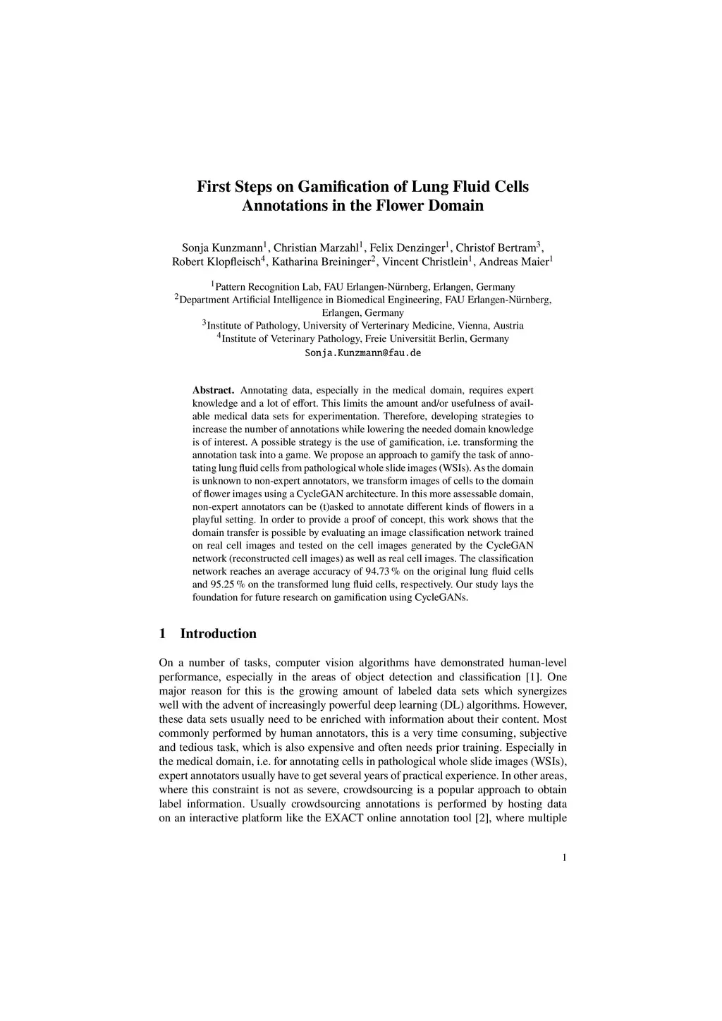 Annotating data, especially in the medical domain, requires expert knowledge and a lot of effort. This limits the amount and/or usefulness of available medical data sets for experimentation. Therefore, developing strategies to increase the number of annotations while lowering the needed domain knowledge is of interest. A possible strategy is the use of gamification, i.e. transforming the annotation task into a game. We propose an approach to gamify the task of annotating lung fluid cells from pathological whole slide images (WSIs). As the domain is unknown to non-expert annotators, we transform images of cells to the domain of flower images using a CycleGAN architecture. In this more assessable domain, non-expert annotators can be (t)asked to annotate different kinds of flowers in a playful setting. In order to provide a proof of concept, this work shows that the domain transfer is possible by evaluating an image classification network trained on real cell images and tested on the cell images generated by the CycleGAN network (reconstructed cell images) as well as real cell images. The classification network reaches an average accuracy of 94.73 % on the original lung fluid cells and 95.25 % on the transformed lung fluid cells, respectively. Our study lays the foundation for future research on gamification using CycleGANs.
