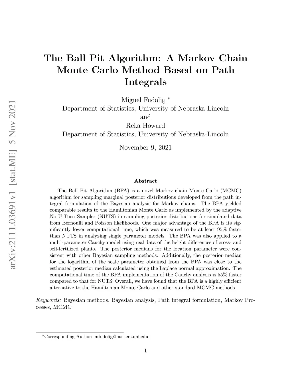 The Ball Pit Algorithm (BPA) is a novel Markov chain Monte Carlo (MCMC) algorithm for sampling marginal posterior distributions developed from the path integral formulation of the Bayesian analysis for Markov chains. The BPA yielded comparable results to the Hamiltonian Monte Carlo as implemented by the adaptive No U-Turn Sampler (NUTS) in sampling posterior distributions for simulated data from Bernoulli and Poisson likelihoods. One major advantage of the BPA is its significantly lower computational time, which was measured to be at least 95% faster than NUTS in analyzing single parameter models. The BPA was also applied to a multi-parameter Cauchy model using real data of the height differences of cross- and self-fertilized plants. The posterior medians for the location parameter were consistent with other Bayesian sampling methods. Additionally, the posterior median for the logarithm of the scale parameter obtained from the BPA was close to the estimated posterior median calculated using the Laplace normal approximation. The computational time of the BPA implementation of the Cauchy analysis is 55% faster compared to that for NUTS. Overall, we have found that the BPA is a highly efficient alternative to the Hamiltonian Monte Carlo and other standard MCMC methods.