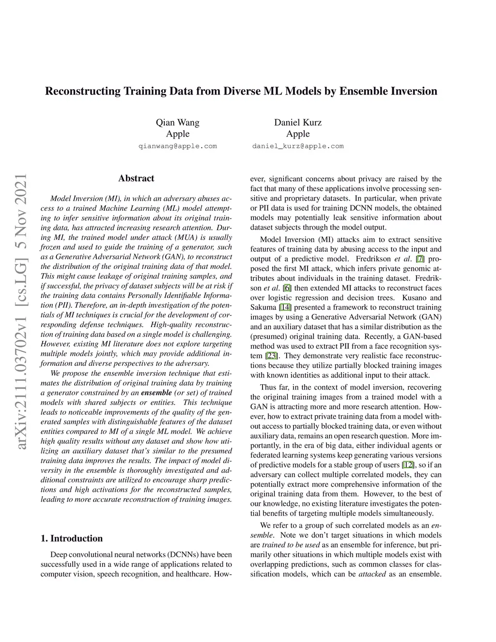 Model Inversion (MI), in which an adversary abuses access to a trained Machine Learning (ML) model attempting to infer sensitive information about its original training data, has attracted increasing research attention. During MI, the trained model under attack (MUA) is usually frozen and used to guide the training of a generator, such as a Generative Adversarial Network (GAN), to reconstruct the distribution of the original training data of that model. This might cause leakage of original training samples, and if successful, the privacy of dataset subjects will be at risk if the training data contains Personally Identifiable Information (PII). Therefore, an in-depth investigation of the potentials of MI techniques is crucial for the development of corresponding defense techniques. High-quality reconstruction of training data based on a single model is challenging. However, existing MI literature does not explore targeting multiple models jointly, which may provide additional information and diverse perspectives to the adversary. We propose the ensemble inversion technique that estimates the distribution of original training data by training a generator constrained by an ensemble (or set) of trained models with shared subjects or entities. This technique leads to noticeable improvements of the quality of the generated samples with distinguishable features of the dataset entities compared to MI of a single ML model. We achieve high quality results without any dataset and show how utilizing an auxiliary dataset that's similar to the presumed training data improves the results. The impact of model diversity in the ensemble is thoroughly investigated and additional constraints are utilized to encourage sharp predictions and high activations for the reconstructed samples, leading to more accurate reconstruction of training images.