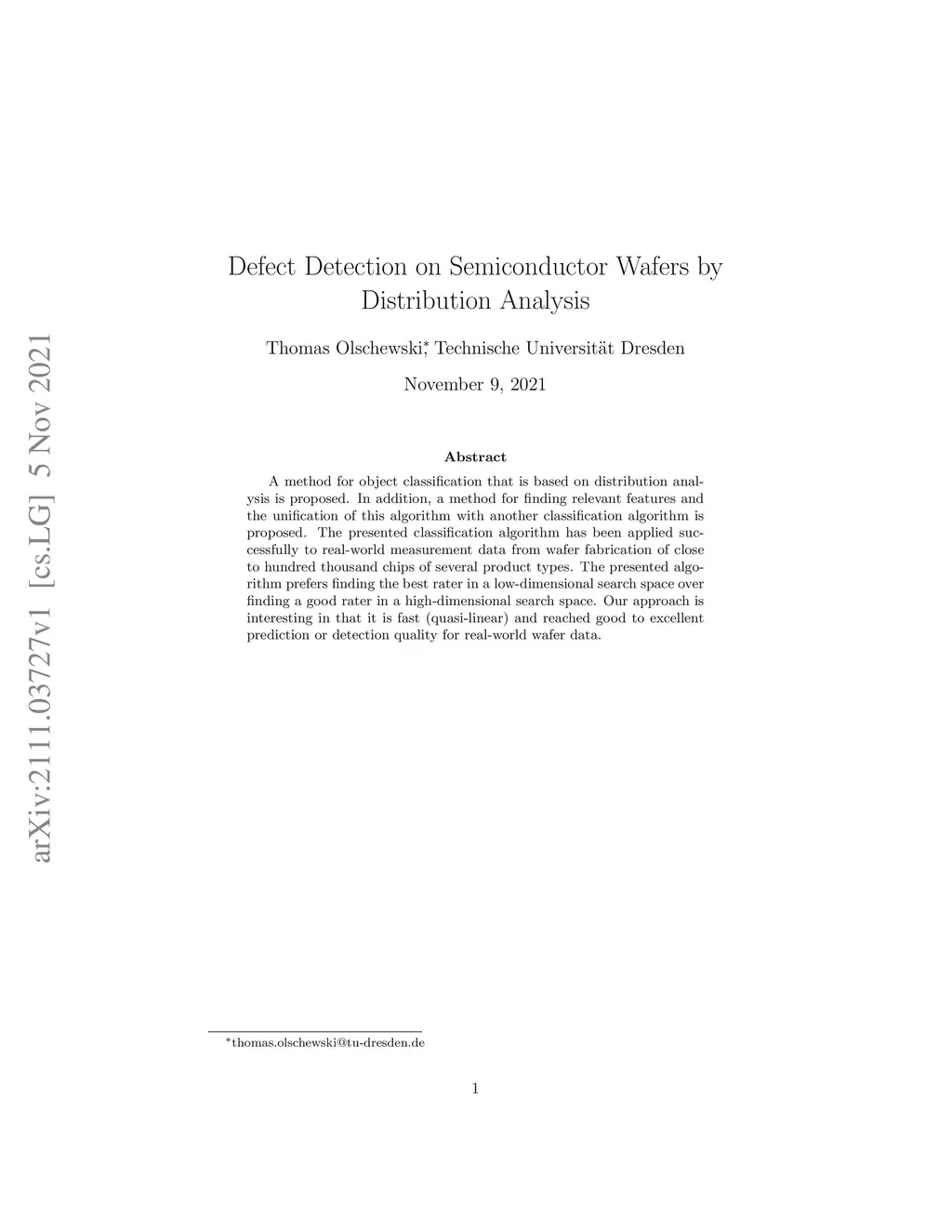 A method for object classification that is based on distribution analysis is proposed. In addition, a method for finding relevant features and the unification of this algorithm with another classification algorithm is proposed. The presented classification algorithm has been applied successfully to real-world measurement data from wafer fabrication of close to hundred thousand chips of several product types. The presented algorithm prefers finding the best rater in a low-dimensional search space over finding a good rater in a high-dimensional search space. Our approach is interesting in that it is fast (quasi-linear) and reached good to excellent prediction or detection quality for real-world wafer data.