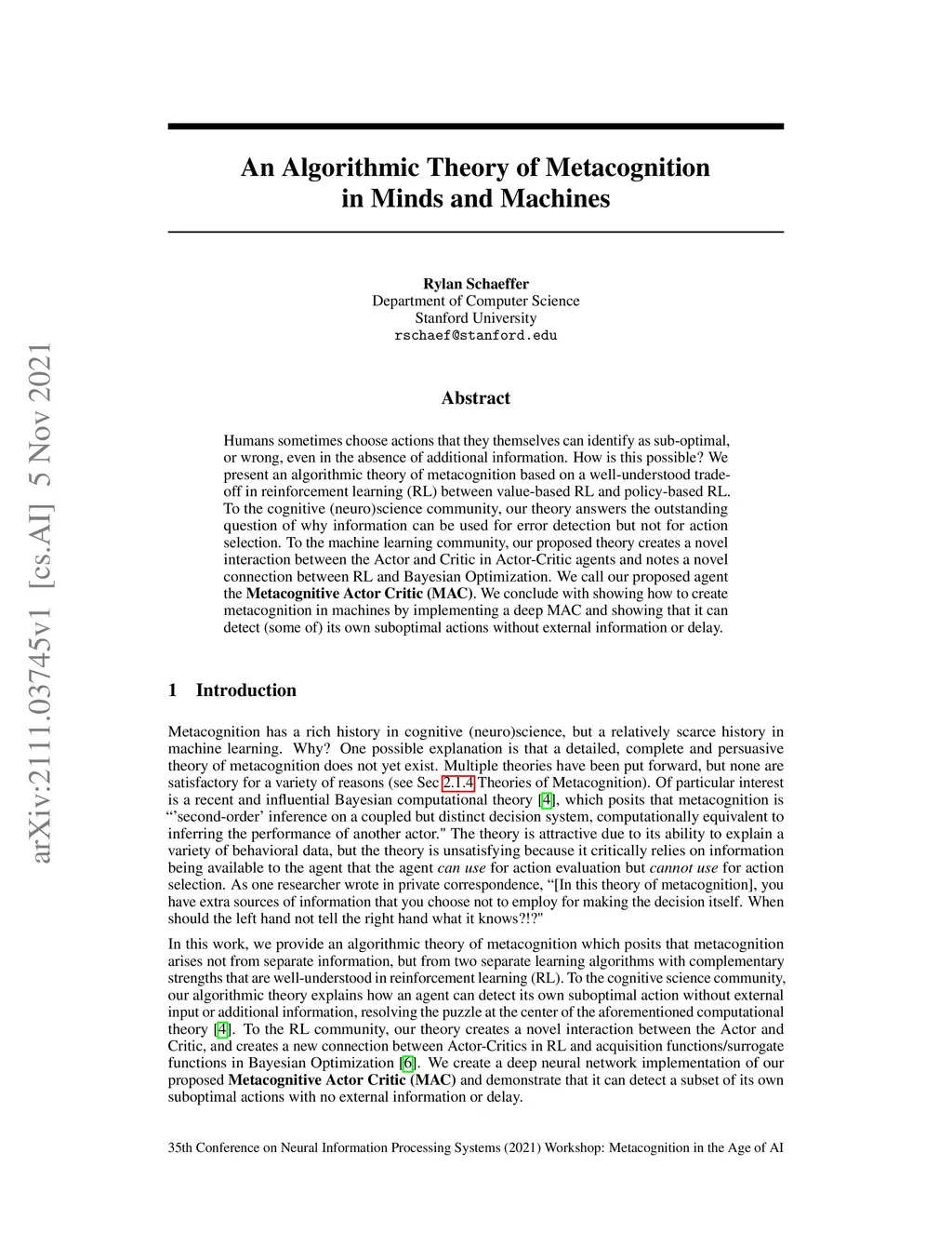 Humans sometimes choose actions that they themselves can identify as sub-optimal, or wrong, even in the absence of additional information. How is this possible? We present an algorithmic theory of metacognition based on a well-understood trade-off in reinforcement learning (RL) between value-based RL and policy-based RL. To the cognitive (neuro)science community, our theory answers the outstanding question of why information can be used for error detection but not for action selection. To the machine learning community, our proposed theory creates a novel interaction between the Actor and Critic in Actor-Critic agents and notes a novel connection between RL and Bayesian Optimization. We call our proposed agent the Metacognitive Actor Critic (MAC). We conclude with showing how to create metacognition in machines by implementing a deep MAC and showing that it can detect (some of) its own suboptimal actions without external information or delay.