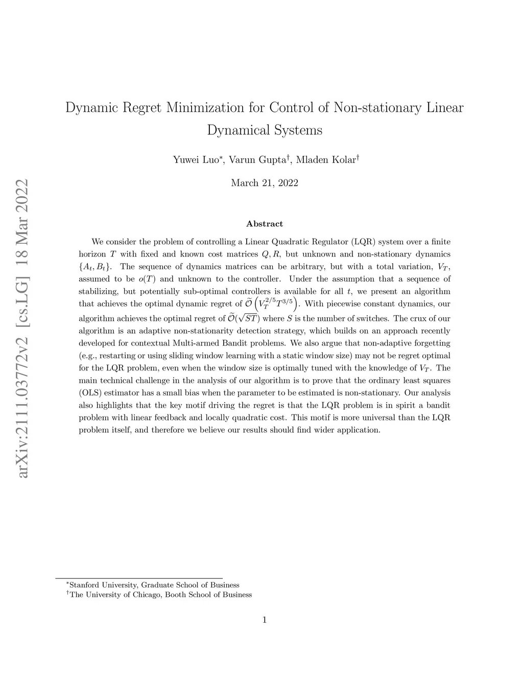 We consider the problem of controlling a Linear Quadratic Regulator (LQR) system over a finite horizon with fixed and known cost matrices , but unknown and non-stationary dynamics . The sequence of dynamics matrices can be arbitrary, but with a total variation, , assumed to be and unknown to the controller. Under the assumption that a sequence of stabilizing, but potentially sub-optimal controllers is available for all , we present an algorithm that achieves the optimal dynamic regret of . With piece-wise constant dynamics, our algorithm achieves the optimal regret of where is the number of switches. The crux of our algorithm is an adaptive non-stationarity detection strategy, which builds on an approach recently developed for contextual Multi-armed Bandit problems. We also argue that non-adaptive forgetting (e.g., restarting or using sliding window learning with a static window size) may not be regret optimal for the LQR problem, even when the window size is optimally tuned with the knowledge of . The main technical challenge in the analysis of our algorithm is to prove that the ordinary least squares (OLS) estimator has a small bias when the parameter to be estimated is non-stationary. Our analysis also highlights that the key motif driving the regret is that the LQR problem is in spirit a bandit problem with linear feedback and locally quadratic cost. This motif is more universal than the LQR problem itself, and therefore we believe our results should find wider application.