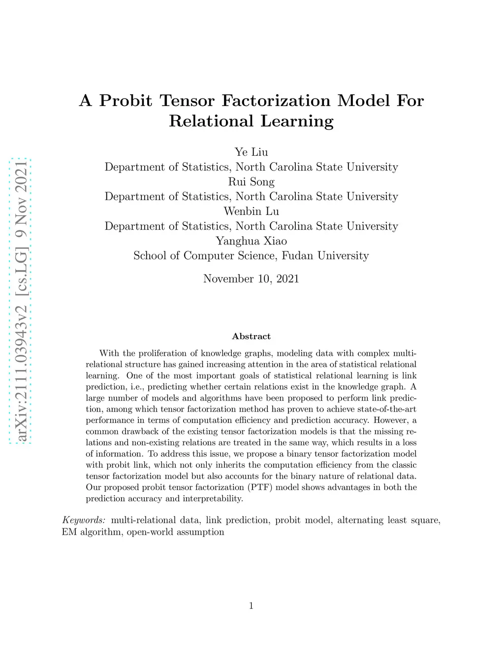 With the proliferation of knowledge graphs, modeling data with complex multirelational structure has gained increasing attention in the area of statistical relational learning. One of the most important goals of statistical relational learning is link prediction, i.e., predicting whether certain relations exist in the knowledge graph. A large number of models and algorithms have been proposed to perform link prediction, among which tensor factorization method has proven to achieve state-of-the-art performance in terms of computation efficiency and prediction accuracy. However, a common drawback of the existing tensor factorization models is that the missing relations and non-existing relations are treated in the same way, which results in a loss of information. To address this issue, we propose a binary tensor factorization model with probit link, which not only inherits the computation efficiency from the classic tensor factorization model but also accounts for the binary nature of relational data. Our proposed probit tensor factorization (PTF) model shows advantages in both the prediction accuracy and interpretability