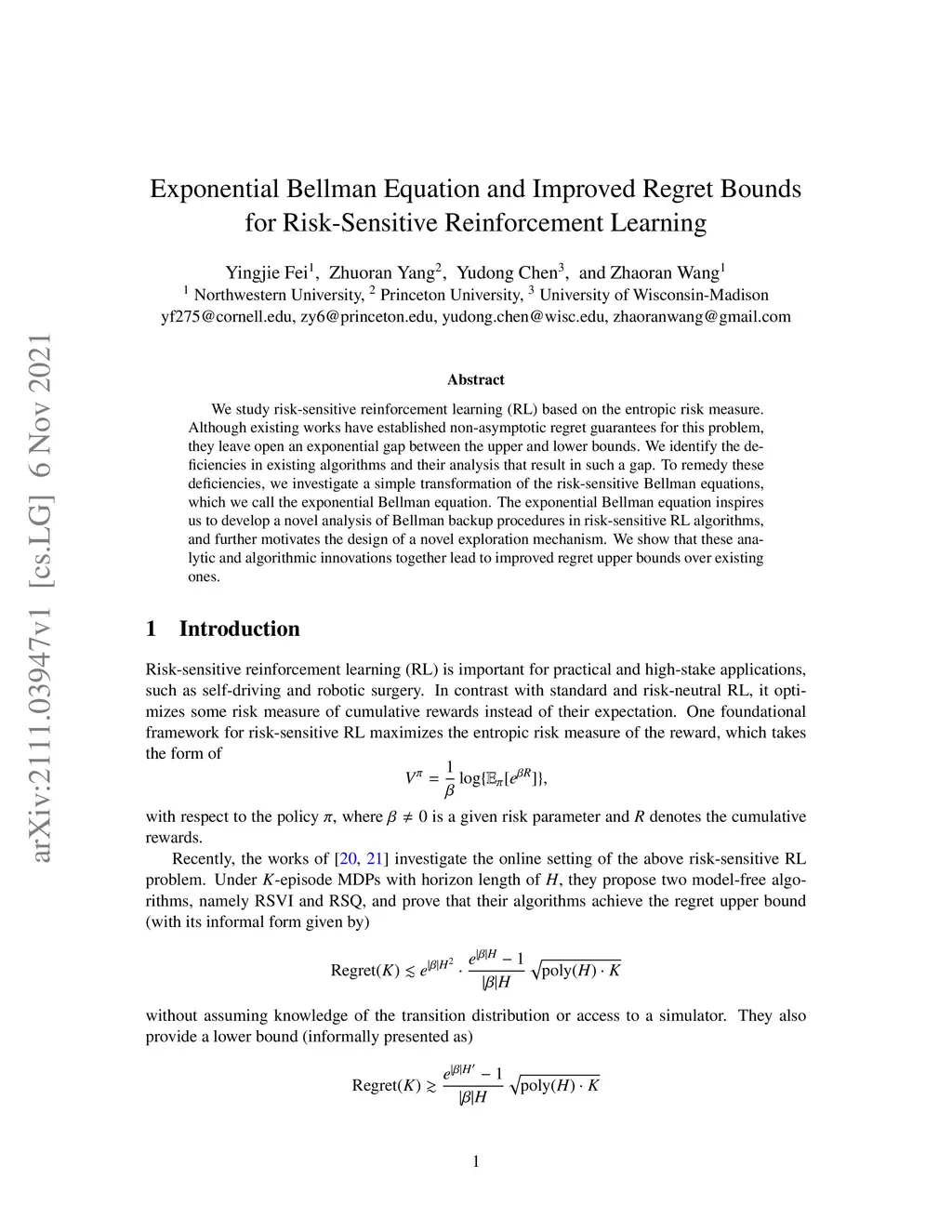 Exponential Bellman Equation and Improved Regret Bounds for