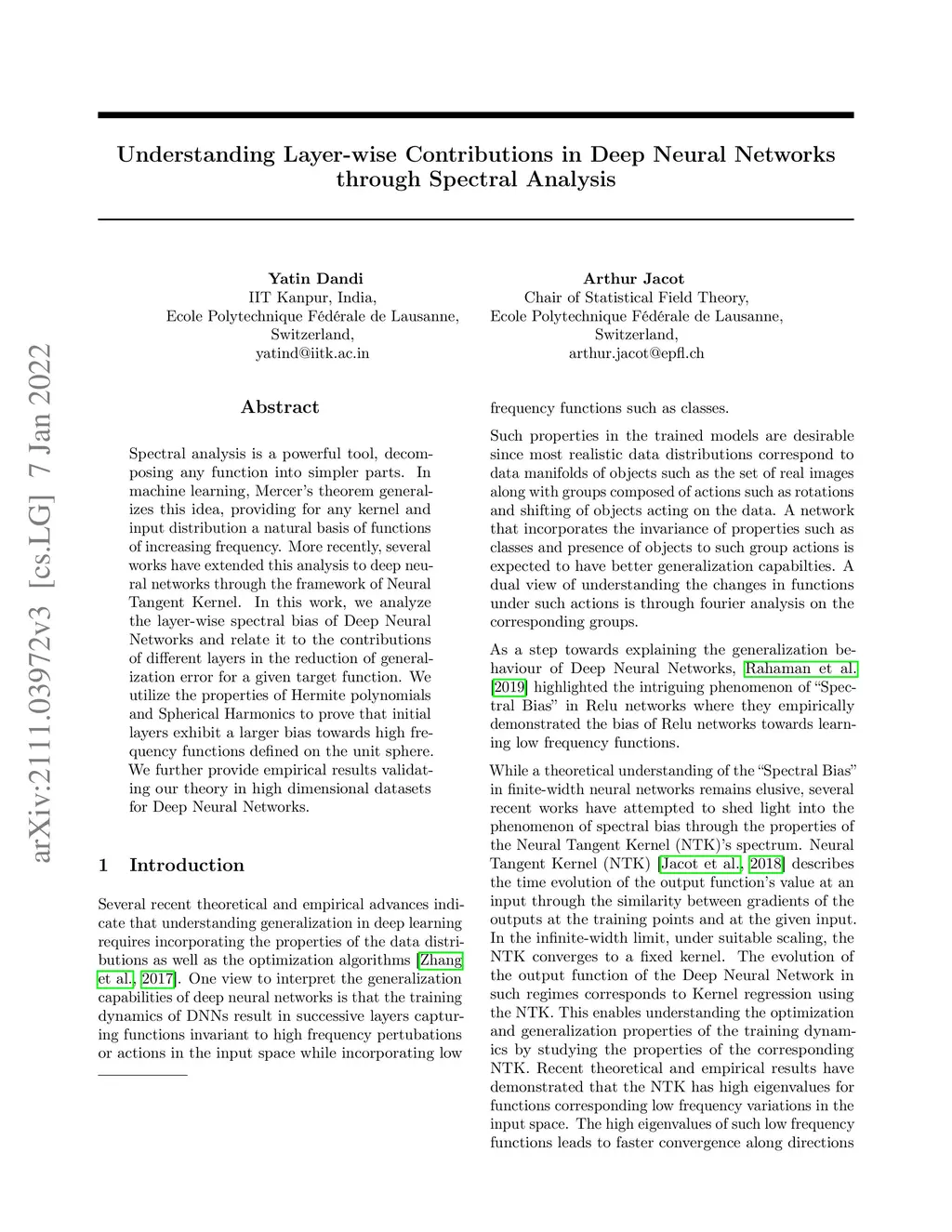 Spectral analysis is a powerful tool, decomposing any function into simpler parts. In machine learning, Mercer's theorem generalizes this idea, providing for any kernel and input distribution a natural basis of functions of increasing frequency. More recently, several works have extended this analysis to deep neural networks through the framework of Neural Tangent Kernel. In this work, we analyze the layer-wise spectral bias of Deep Neural Networks and relate it to the contributions of different layers in the reduction of generalization error for a given target function. We utilize the properties of Hermite polynomials and Spherical Harmonics to prove that initial layers exhibit a larger bias towards high-frequency functions defined on the unit sphere. We further provide empirical results validating our theory in high dimensional datasets for Deep Neural Networks.