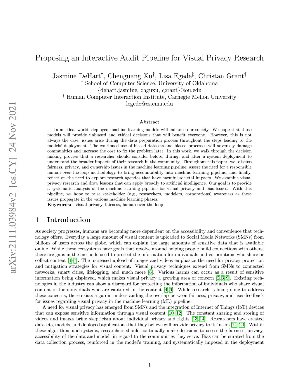 In an ideal world, deployed machine learning models will enhance our society. We hope that those models will provide unbiased and ethical decisions that will benefit everyone. However, this is not always the case; issues arise during the data preparation process throughout the steps leading to the models' deployment. The continued use of biased datasets and processes will adversely damage communities and increase the cost of fixing the problem later. In this work, we walk through the decision-making process that a researcher should consider before, during, and after a system deployment to understand the broader impacts of their research in the community. Throughout this paper, we discuss fairness, privacy, and ownership issues in the machine learning pipeline; we assert the need for a responsible human-over-the-loop methodology to bring accountability into the machine learning pipeline, and finally, reflect on the need to explore research agendas that have harmful societal impacts. We examine visual privacy research and draw lessons that can apply broadly to artificial intelligence. Our goal is to systematically analyze the machine learning pipeline for visual privacy and bias issues. We hope to raise stakeholder (e.g., researchers, modelers, corporations) awareness as these issues propagate in this pipeline's various machine learning phases.