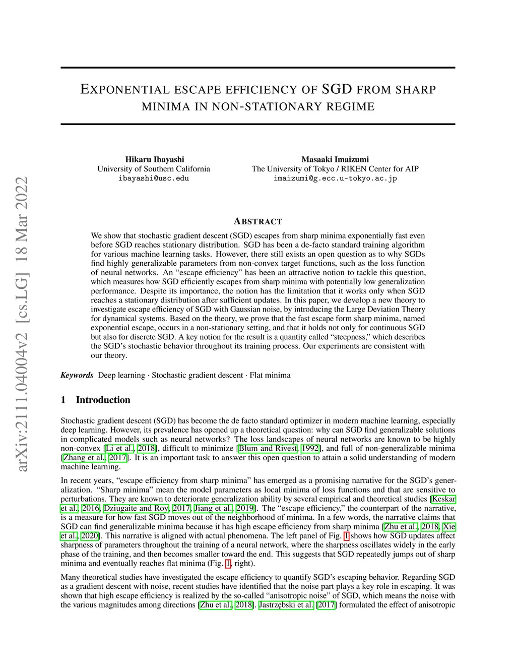 We show that stochastic gradient descent (SGD) escapes from sharp minima exponentially fast even before SGD reaches stationary distribution. SGD has been a de-facto standard training algorithm for various machine learning tasks. However, there still exists an open question as to why SGDs find highly generalizable parameters from non-convex target functions, such as the loss function of neural networks. An "escape efficiency" has been an attractive notion to tackle this question, which measures how SGD efficiently escapes from sharp minima with potentially low generalization performance. Despite its importance, the notion has the limitation that it works only when SGD reaches a stationary distribution after sufficient updates. In this paper, we develop a new theory to investigate escape efficiency of SGD with Gaussian noise, by introducing the Large Deviation Theory for dynamical systems. Based on the theory, we prove that the fast escape form sharp minima, named exponential escape, occurs in a non-stationary setting, and that it holds not only for continuous SGD but also for discrete SGD. A key notion for the result is a quantity called "steepness," which describes the SGD's stochastic behavior throughout its training process. Our experiments are consistent with our theory.