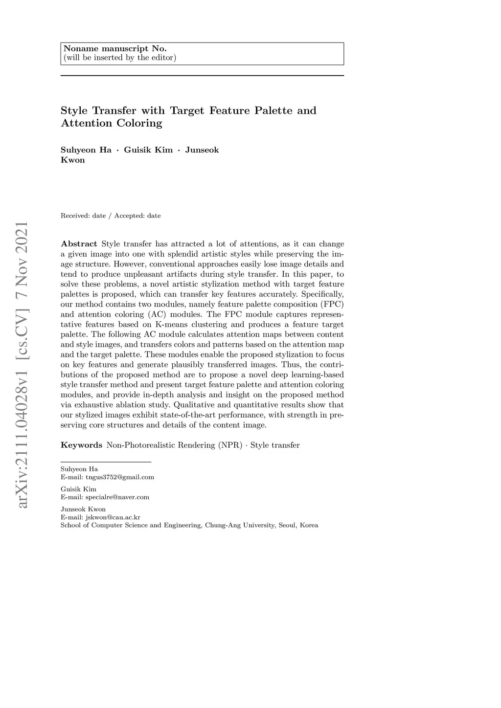Style transfer has attracted a lot of attentions, as it can change a given image into one with splendid artistic styles while preserving the image structure. However, conventional approaches easily lose image details and tend to produce unpleasant artifacts during style transfer. In this paper, to solve these problems, a novel artistic stylization method with target feature palettes is proposed, which can transfer key features accurately. Specifically, our method contains two modules, namely feature palette composition (FPC) and attention coloring (AC) modules. The FPC module captures representative features based on K-means clustering and produces a feature target palette. The following AC module calculates attention maps between content and style images, and transfers colors and patterns based on the attention map and the target palette. These modules enable the proposed stylization to focus on key features and generate plausibly transferred images. Thus, the contributions of the proposed method are to propose a novel deep learning-based style transfer method and present target feature palette and attention coloring modules, and provide in-depth analysis and insight on the proposed method via exhaustive ablation study. Qualitative and quantitative results show that our stylized images exhibit state-of-the-art performance, with strength in preserving core structures and details of the content image.