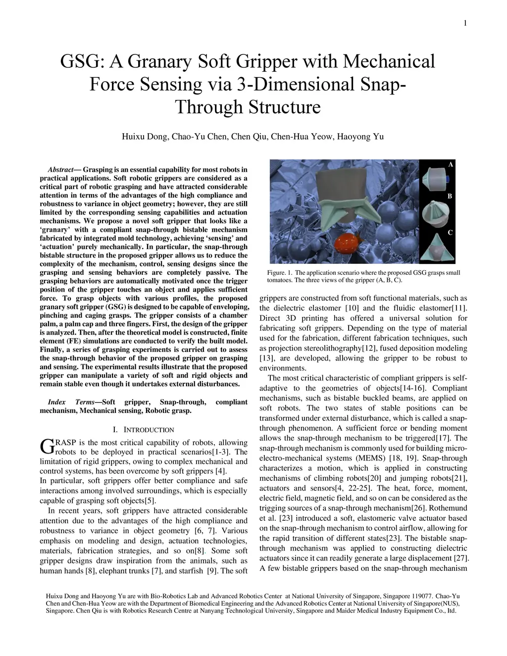Grasping is an essential capability for most robots in practical applications. Soft robotic grippers are considered as a critical part of robotic grasping and have attracted considerable attention in terms of the advantages of the high compliance and robustness to variance in object geometry; however, they are still limited by the corresponding sensing capabilities and actuation mechanisms. We propose a novel soft gripper that looks like a granary with a compliant snap-through bistable mechanism fabricated by integrated mold technology, achieving sensing and actuation purely mechanically. In particular, the snap-through bistable structure in the proposed gripper allows us to reduce the complexity of the mechanism, control, sensing designs since the grasping and sensing behaviors are completely passive. The grasping behaviors are automatically motivated once the trigger position of the gripper touches an object and applies sufficient force. To grasp objects with various profiles, the proposed granary soft gripper (GSG) is designed to be capable of enveloping, pinching and caging grasps. The gripper consists of a chamber palm, a palm cap and three fingers. First, the design of the gripper is analyzed. Then, after the theoretical model is constructed, finite element (FE) simulations are conducted to verify the built model. Finally, a series of grasping experiments is carried out to assess the snap-through behavior of the proposed gripper on grasping and sensing. The experimental results illustrate that the proposed gripper can manipulate a variety of soft and rigid objects and remain stable even though it undertakes external disturbances.