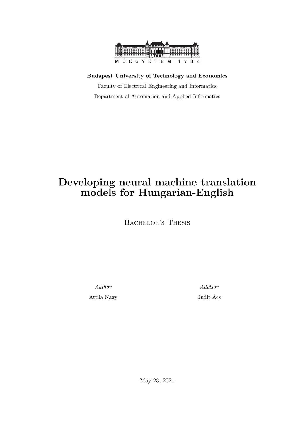 I train models for the task of neural machine translation for English-Hungarian and Hungarian-English, using the Hunglish2 corpus. The main contribution of this work is evaluating different data augmentation methods during the training of NMT models. I propose 5 different augmentation methods that are structure-aware, meaning that instead of randomly selecting words for blanking or replacement, the dependency tree of sentences is used as a basis for augmentation. I start my thesis with a detailed literature review on neural networks, sequential modeling, neural machine translation, dependency parsing and data augmentation. After a detailed exploratory data analysis and preprocessing of the Hunglish2 corpus, I perform experiments with the proposed data augmentation techniques. The best model for Hungarian-English achieves a BLEU score of 33.9, while the best model for English-Hungarian achieves a BLEU score of 28.6.