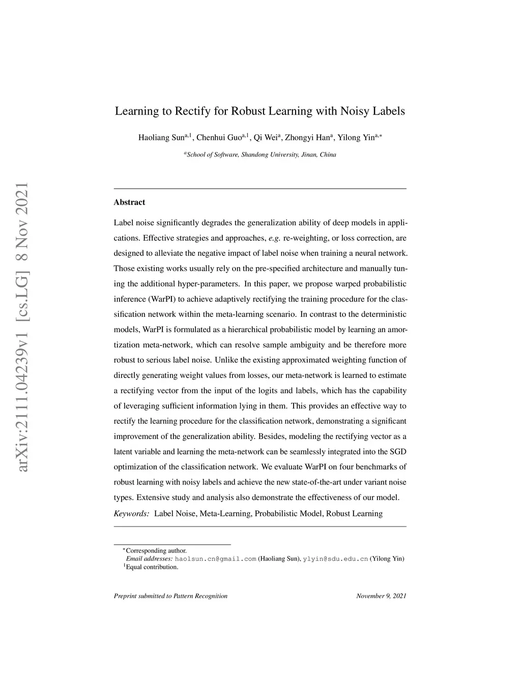 Label noise significantly degrades the generalization ability of deep models in applications. Effective strategies and approaches, \textit{e.g.} re-weighting, or loss correction, are designed to alleviate the negative impact of label noise when training a neural network. Those existing works usually rely on the pre-specified architecture and manually tuning the additional hyper-parameters. In this paper, we propose warped probabilistic inference (WarPI) to achieve adaptively rectifying the training procedure for the classification network within the meta-learning scenario. In contrast to the deterministic models, WarPI is formulated as a hierarchical probabilistic model by learning an amortization meta-network, which can resolve sample ambiguity and be therefore more robust to serious label noise. Unlike the existing approximated weighting function of directly generating weight values from losses, our meta-network is learned to estimate a rectifying vector from the input of the logits and labels, which has the capability of leveraging sufficient information lying in them. This provides an effective way to rectify the learning procedure for the classification network, demonstrating a significant improvement of the generalization ability. Besides, modeling the rectifying vector as a latent variable and learning the meta-network can be seamlessly integrated into the SGD optimization of the classification network. We evaluate WarPI on four benchmarks of robust learning with noisy labels and achieve the new state-of-the-art under variant noise types. Extensive study and analysis also demonstrate the effectiveness of our model.