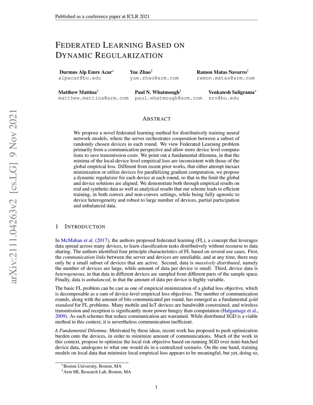 Federated Learning Based on Dynamic Regularization