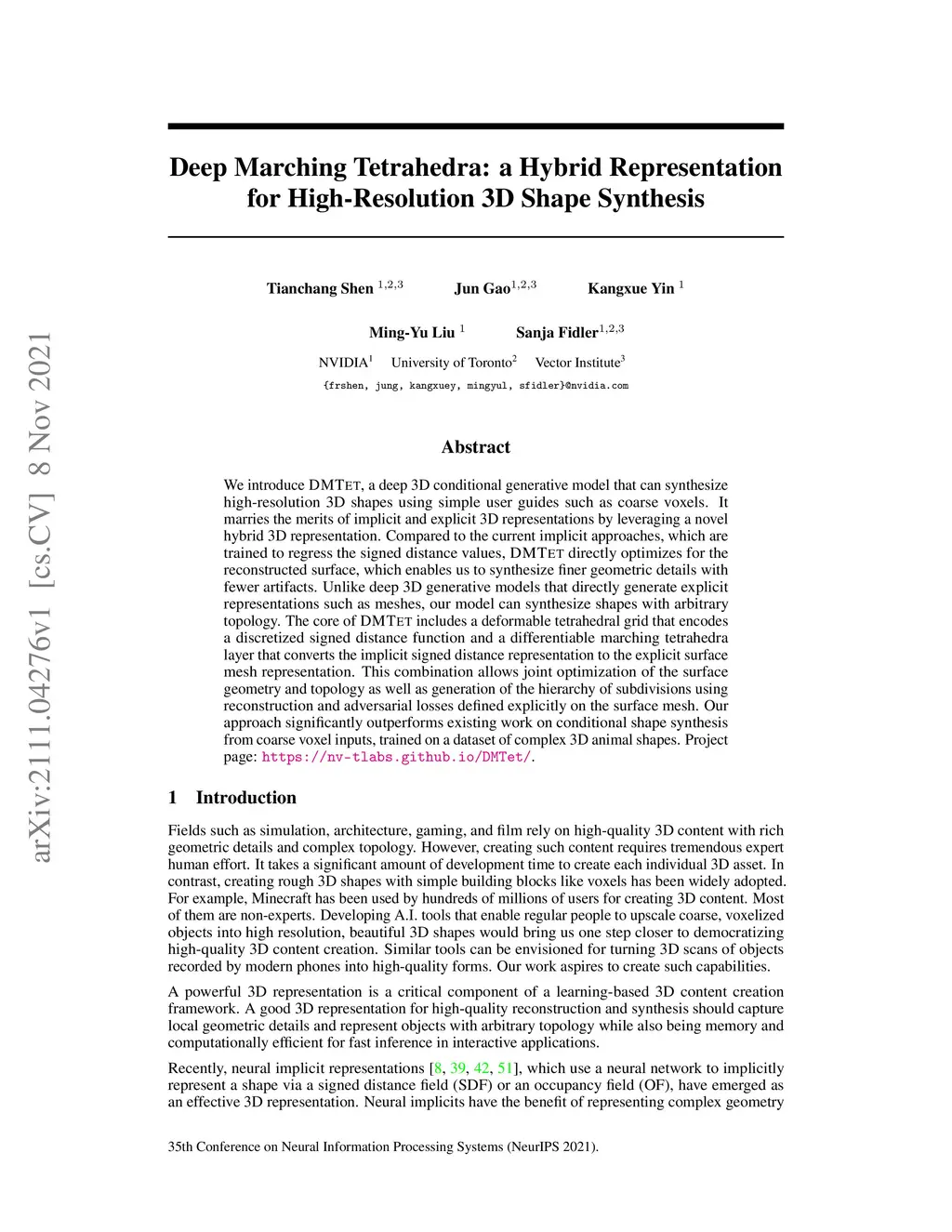 We introduce DMTet, a deep 3D conditional generative model that can synthesize high-resolution 3D shapes using simple user guides such as coarse voxels. It marries the merits of implicit and explicit 3D representations by leveraging a novel hybrid 3D representation. Compared to the current implicit approaches, which are trained to regress the signed distance values, DMTet directly optimizes for the reconstructed surface, which enables us to synthesize finer geometric details with fewer artifacts. Unlike deep 3D generative models that directly generate explicit representations such as meshes, our model can synthesize shapes with arbitrary topology. The core of DMTet includes a deformable tetrahedral grid that encodes a discretized signed distance function and a differentiable marching tetrahedra layer that converts the implicit signed distance representation to the explicit surface mesh representation. This combination allows joint optimization of the surface geometry and topology as well as generation of the hierarchy of subdivisions using reconstruction and adversarial losses defined explicitly on the surface mesh. Our approach significantly outperforms existing work on conditional shape synthesis from coarse voxel inputs, trained on a dataset of complex 3D animal shapes. Project page: https://nv-tlabs.github.io/DMTet/.