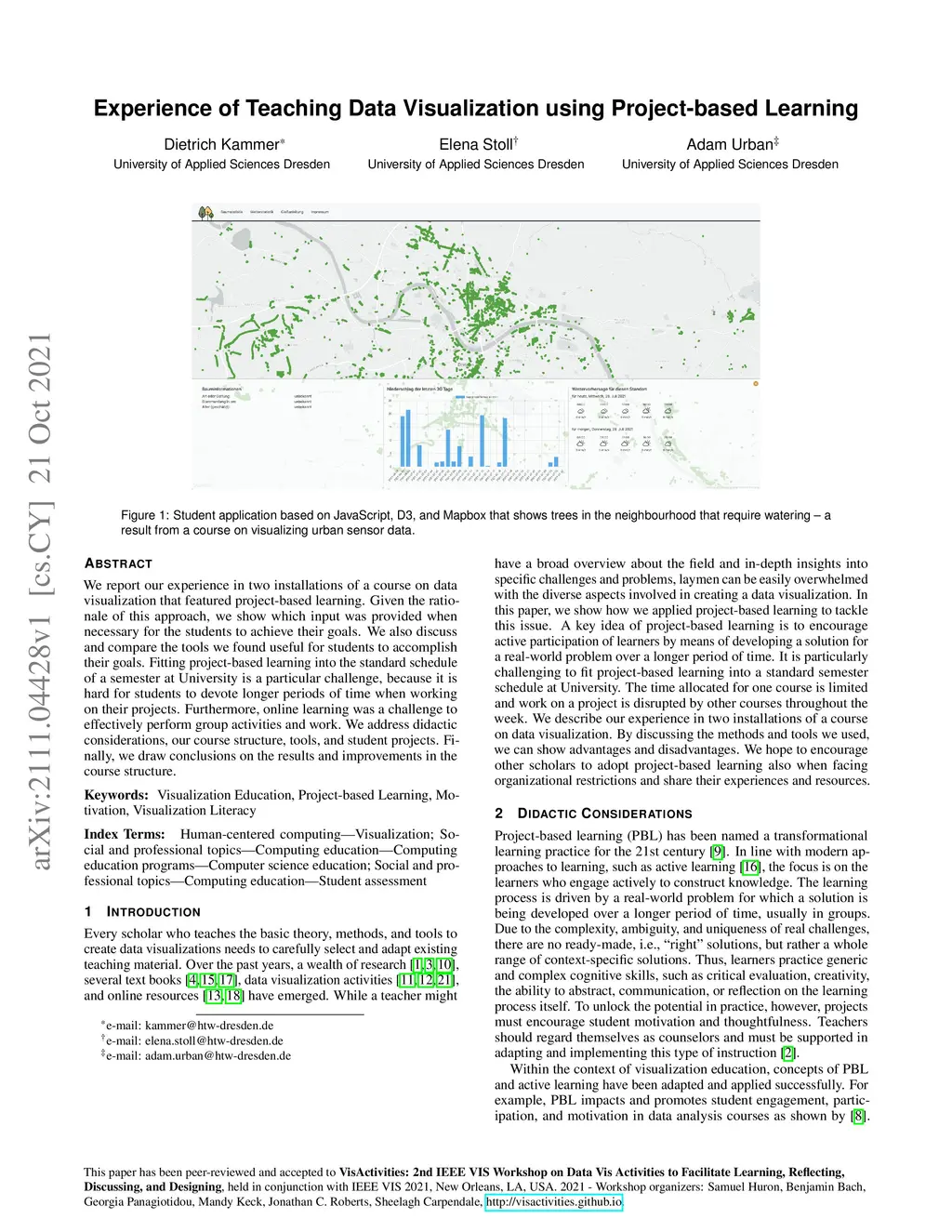 We report our experience in two installations of a course on data visualization that featured project-based learning. Given the rationale of this approach, we show which input was provided when necessary for the students to achieve their goals. We also discuss and compare the tools we found useful for students to accomplish their goals. Fitting project-based learning into the standard schedule of a semester at University is a particular challenge, because it is hard for students to devote longer periods of time when working on their projects. Furthermore, online learning was a challenge to effectively perform group activities and work. We address didactic considerations, our course structure, tools, and student projects. Finally, we draw conclusions on the results and improvements in the course structure.