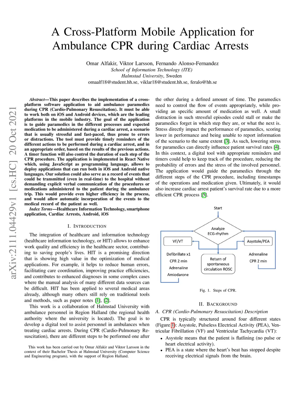 This paper describes the implementation of a crossplatform software application to aid ambulance paramedics during CPR (Cardio-Pulmonary Resuscitation). It must be able to work both on iOS and Android devices, which are the leading platforms in the mobile industry. The goal of the application is to guide paramedics in the different processes and expected medication to be administered during a cardiac arrest, a scenario that is usually stressful and fast-paced, thus prone to errors or distractions. The tool must provide timely reminders of the different actions to be performed during a cardiac arrest, and in an appropriate order, based on the results of the previous actions. A timer function will also control the duration of each step of the CPR procedure. The application is implemented in React Native which, using JavaScript as programming language, allows to deploy applications that can run both in iOS and Android native languages. Our solution could also serve as a record of events that could be transmitted (even in real-time) to the hospital without demanding explicit verbal communication of the procedures or medications administered to the patient during the ambulance trip. This would provide even higher efficiency in the process, and would allow automatic incorporation of the events to the medical record of the patient as well.