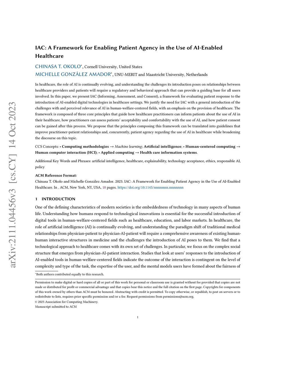 In healthcare, the role of AI is continually evolving, and understanding the challenges its introduction poses on relationships between healthcare providers and patients will require a regulatory and behavioral approach that can provide a guiding base for all users involved. In this paper, we present IAC (Informing, Assessment, and Consent), a framework for evaluating patient response to the introduction of AI-enabled digital technologies in healthcare settings. We justify the need for IAC with a general introduction of the challenges with and perceived relevance of AI in human-welfare-centered fields, with an emphasis on the provision of healthcare. The framework is composed of three core principles that guide how healthcare practitioners can inform patients about the use of AI in their healthcare, how practitioners can assess patients' acceptability and comfortability with the use of AI, and how patient consent can be gained after this process. We propose that the principles composing this framework can be translated into guidelines that improve practitioner-patient relationships and, concurrently, patient agency regarding the use of AI in healthcare while broadening the discourse on this topic.