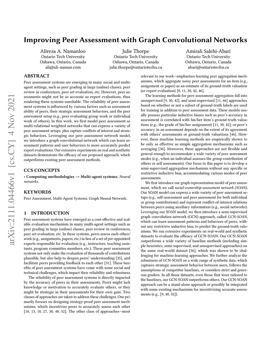 Peer assessment systems are emerging in many social and multi-agent settings, such as peer grading in large (online) classes, peer review in conferences, peer art evaluation, etc. However, peer assessments might not be as accurate as expert evaluations, thus rendering these systems unreliable. The reliability of peer assessment systems is influenced by various factors such as assessment ability of peers, their strategic assessment behaviors, and the peer assessment setup (e.g., peer evaluating group work or individual work of others). In this work, we first model peer assessment as multi-relational weighted networks that can express a variety of peer assessment setups, plus capture conflicts of interest and strategic behaviors. Leveraging our peer assessment network model, we introduce a graph convolutional network which can learn assessment patterns and user behaviors to more accurately predict expert evaluations. Our extensive experiments on real and synthetic datasets demonstrate the efficacy of our proposed approach, which outperforms existing peer assessment methods.