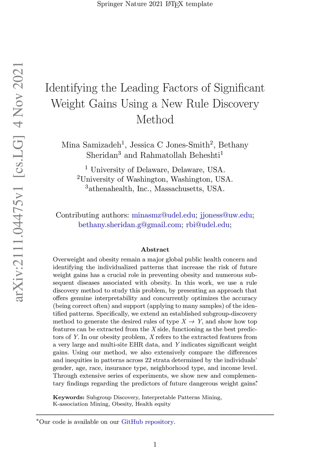 Overweight and obesity remain a major global public health concern and identifying the individualized patterns that increase the risk of future weight gains has a crucial role in preventing obesity and numerous sub-sequent diseases associated with obesity. In this work, we use a rule discovery method to study this problem, by presenting an approach that offers genuine interpretability and concurrently optimizes the accuracy(being correct often) and support (applying to many samples) of the identified patterns. Specifically, we extend an established subgroup-discovery method to generate the desired rules of type X -> Y and show how top features can be extracted from the X side, functioning as the best predictors of Y. In our obesity problem, X refers to the extracted features from very large and multi-site EHR data, and Y indicates significant weight gains. Using our method, we also extensively compare the differences and inequities in patterns across 22 strata determined by the individual's gender, age, race, insurance type, neighborhood type, and income level. Through extensive series of experiments, we show new and complementary findings regarding the predictors of future dangerous weight gains.