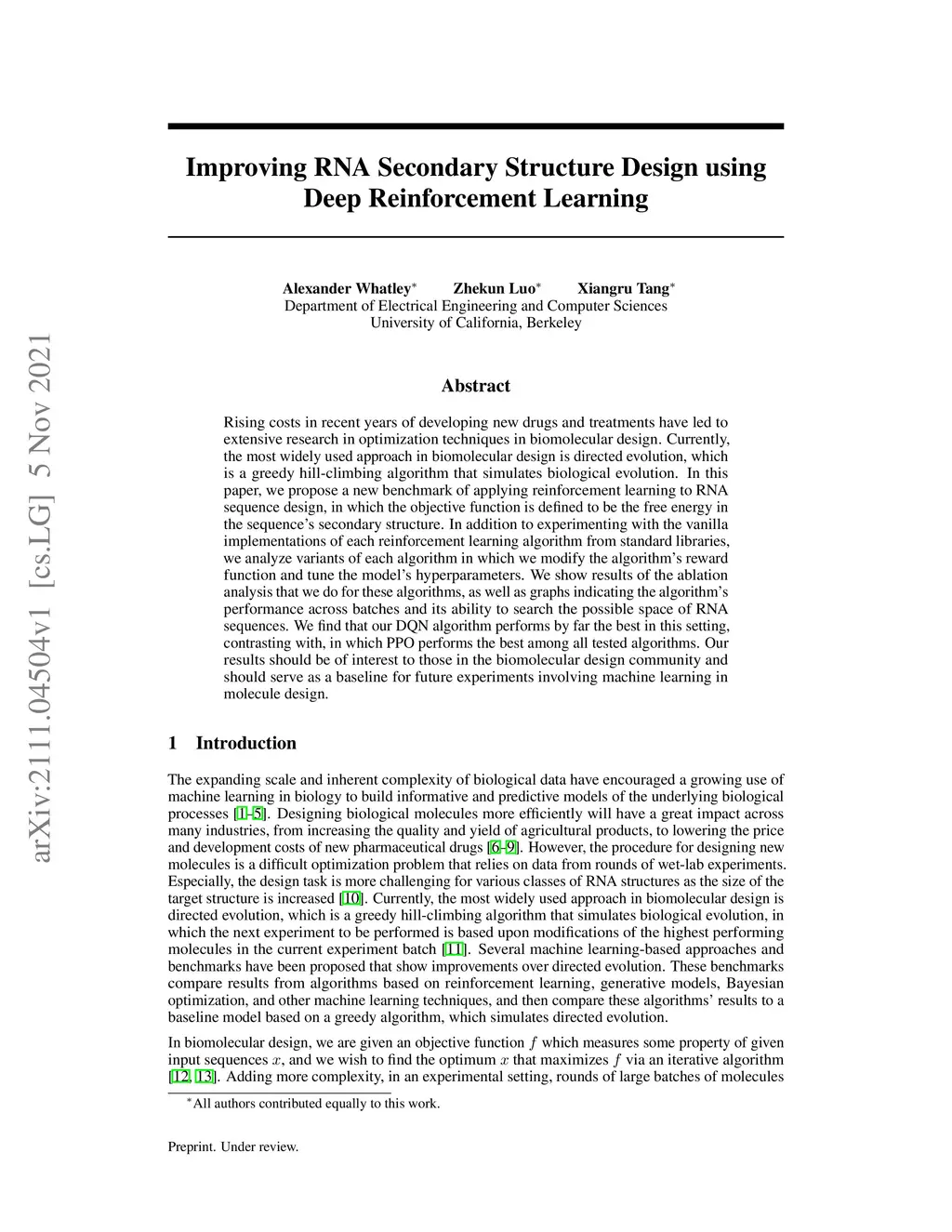 Rising costs in recent years of developing new drugs and treatments have led to extensive research in optimization techniques in biomolecular design. Currently, the most widely used approach in biomolecular design is directed evolution, which is a greedy hill-climbing algorithm that simulates biological evolution. In this paper, we propose a new benchmark of applying reinforcement learning to RNA sequence design, in which the objective function is defined to be the free energy in the sequence's secondary structure. In addition to experimenting with the vanilla implementations of each reinforcement learning algorithm from standard libraries, we analyze variants of each algorithm in which we modify the algorithm's reward function and tune the model's hyperparameters. We show results of the ablation analysis that we do for these algorithms, as well as graphs indicating the algorithm's performance across batches and its ability to search the possible space of RNA sequences. We find that our DQN algorithm performs by far the best in this setting, contrasting with, in which PPO performs the best among all tested algorithms. Our results should be of interest to those in the biomolecular design community and should serve as a baseline for future experiments involving machine learning in molecule design.