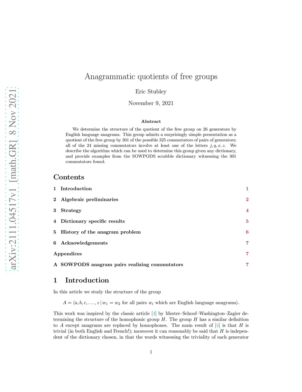 We determine the structure of the quotient of the free group on 26 generators by English language anagrams. This group admits a surprisingly simple presentation as a quotient of the free group by 301 of the possible 325 commutators of pairs of generators; all of the 24 missing commutators involve at least one of the letters j, q, x, z. We describe the algorithm which can be used to determine this group given any dictionary, and provide examples from the SOWPODS scrabble dictionary witnessing the 301 commutators found.