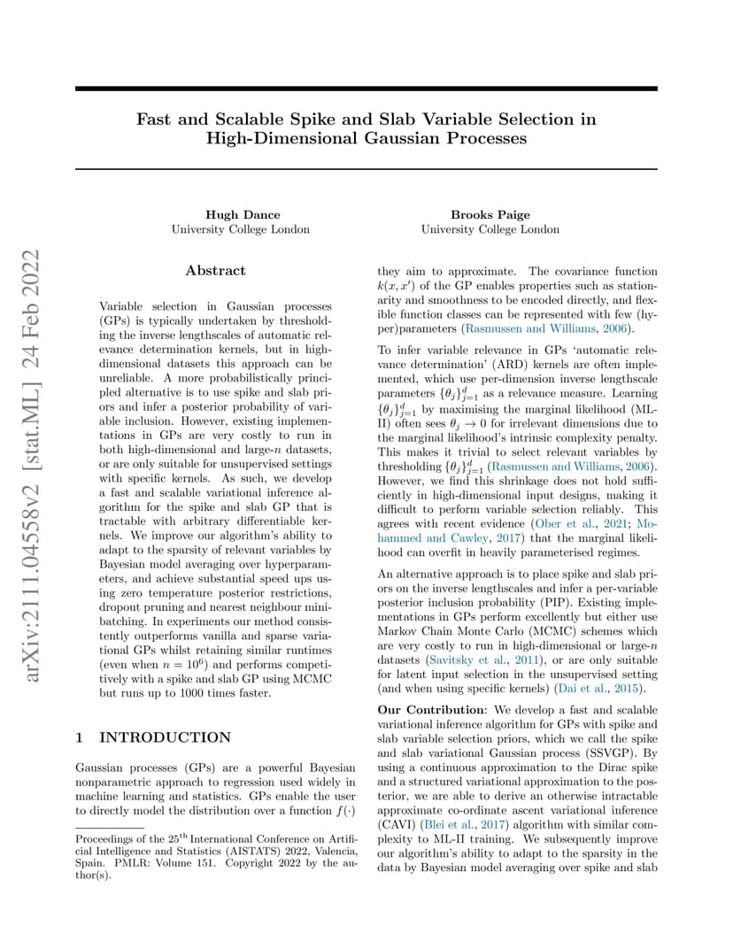 Variable selection in Gaussian processes (GPs) is typically undertaken by thresholding the inverse lengthscales of automatic relevance determination kernels, but in high-dimensional datasets this approach can be unreliable. A more probabilistically principled alternative is to use spike and slab priors and infer a posterior probability of variable inclusion. However, existing implementations in GPs are very costly to run in both high-dimensional and large- datasets, or are only suitable for unsupervised settings with specific kernels. As such, we develop a fast and scalable variational inference algorithm for the spike and slab GP that is tractable with arbitrary differentiable kernels. We improve our algorithm's ability to adapt to the sparsity of relevant variables by Bayesian model averaging over hyperparameters, and achieve substantial speed ups using zero temperature posterior restrictions, dropout pruning and nearest neighbour minibatching. In experiments our method consistently outperforms vanilla and sparse variational GPs whilst retaining similar runtimes (even when ) and performs competitively with a spike and slab GP using MCMC but runs up to times faster.