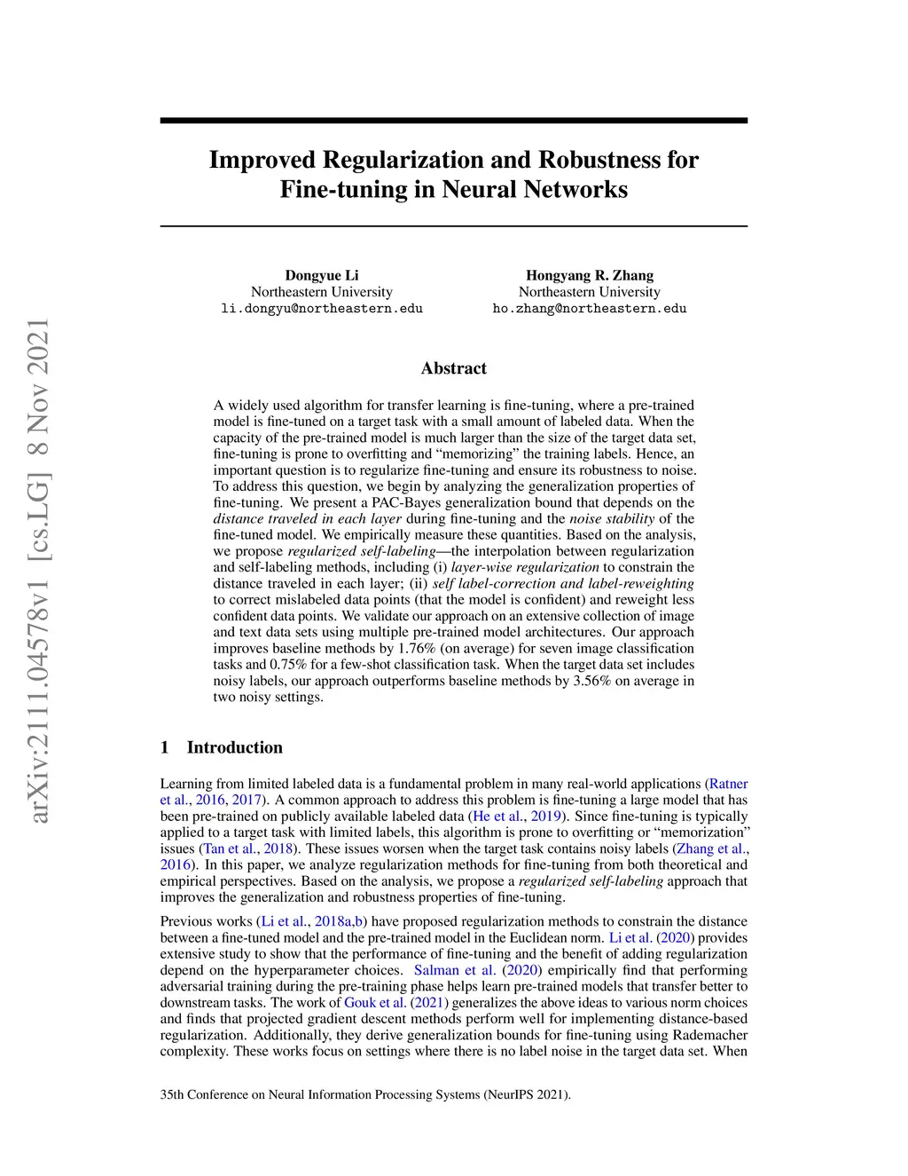 A widely used algorithm for transfer learning is fine-tuning, where a pre-trained model is fine-tuned on a target task with a small amount of labeled data. When the capacity of the pre-trained model is significantly larger than the size of the target dataset, fine-tuning is prone to overfitting and memorizing the training labels. Hence, a crucial question is to regularize fine-tuning and ensure its robustness against noise. To address this question, we begin by analyzing the generalization properties of fine-tuning. We present a PAC-Bayes generalization bound that depends on the distance traveled in each layer during fine-tuning and the noise stability of the fine-tuned model. We empirically measure these quantities. Based on the analysis, we propose regularized self-labeling -- the interpolation between regularization and self-labeling methods, including (i) layer-wise regularization to constrain the distance traveled in each layer; (ii) self-label-correction and label-reweighting to correct mislabeled data points (that the model is confident) and reweight less confident data points. We validate our approach on an extensive collection of image and text datasets using multiple pre-trained model architectures. Our approach improves baseline methods by 1.76% (on average) for seven image classification tasks and 0.75% for a few-shot classification task. When the target data set includes noisy labels, our approach outperforms baseline methods by an average of 3.56% in two noisy settings.
