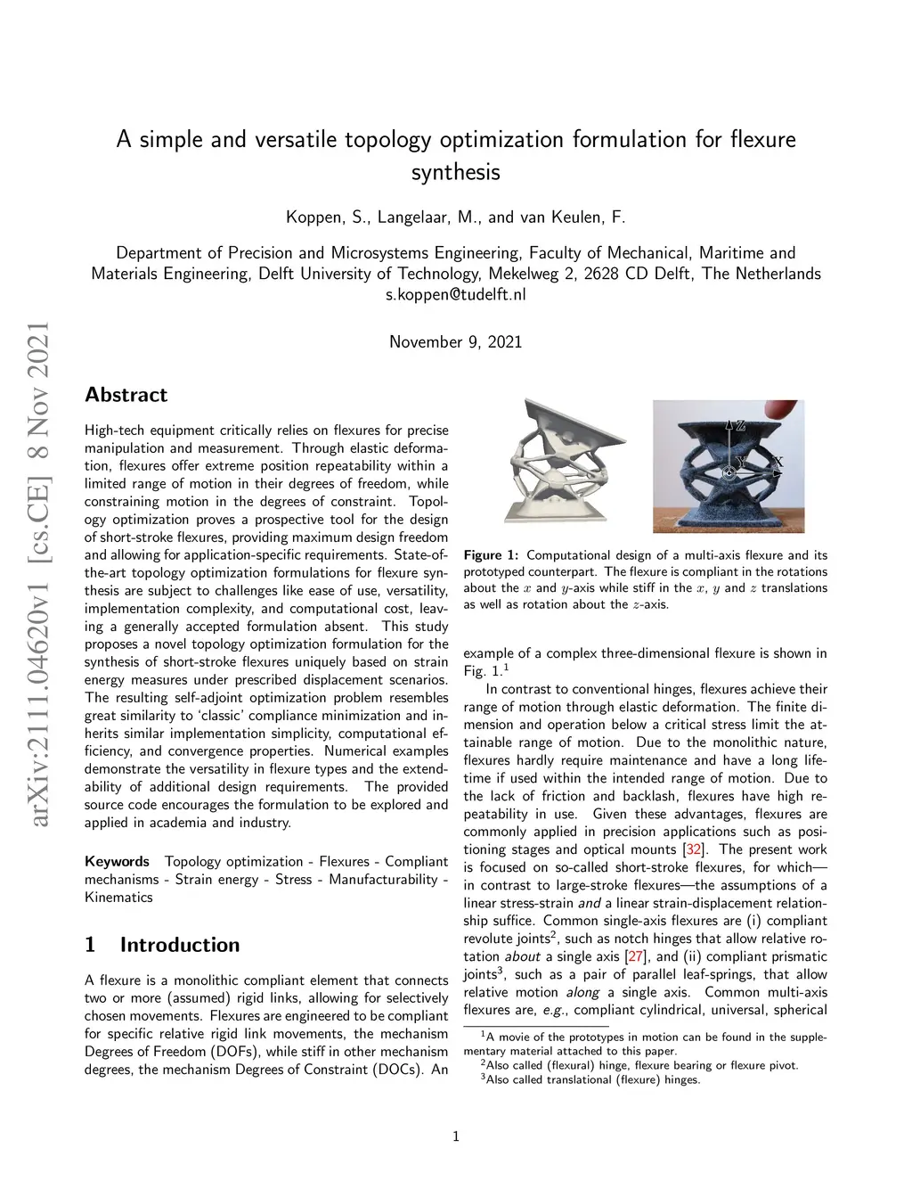 High-tech equipment critically relies on flexures for precise manipulation and measurement. Through elastic deformation, flexures offer extreme position repeatability within a limited range of motion in their degrees of freedom, while constraining motion in the degrees of constraint. Topology optimization proves a prospective tool for the design of short-stroke flexures, providing maximum design freedom and allowing for application-specific requirements. State-of-the-art topology optimization formulations for flexure synthesis are subject to challenges like ease of use, versatility, implementation complexity, and computational cost, leaving a generally accepted formulation absent. This study proposes a novel topology optimization formulation for the synthesis of short-stroke flexures uniquely based on strain energy measures under prescribed displacement scenarios. The resulting self-adjoint optimization problem resembles great similarity to classic compliance minimization and inherits similar implementation simplicity, computational efficiency, and convergence properties. Numerical examples demonstrate the versatility in flexure types and the extendability of additional design requirements. The provided source code encourages the formulation to be explored and applied in academia and industry.