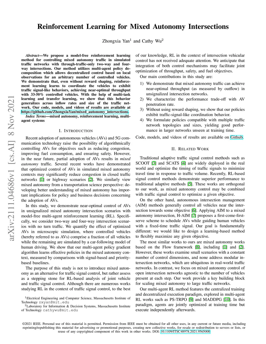 Reinforcement Learning for Mixed Autonomy Intersections