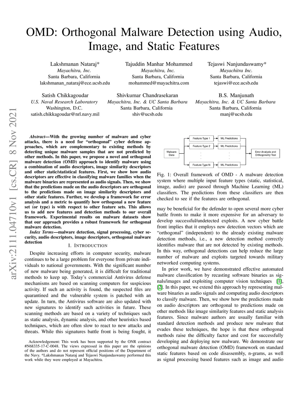 OMD: Orthogonal Malware Detection Using Audio, Image, and Static