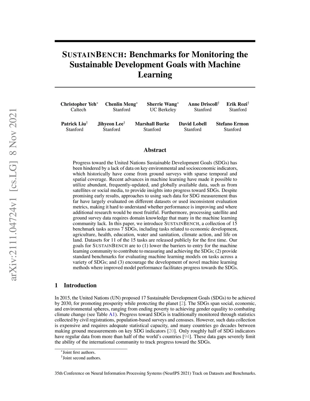 Progress toward the United Nations Sustainable Development Goals (SDGs) has been hindered by a lack of data on key environmental and socioeconomic indicators, which historically have come from ground surveys with sparse temporal and spatial coverage. Recent advances in machine learning have made it possible to utilize abundant, frequently-updated, and globally available data, such as from satellites or social media, to provide insights into progress toward SDGs. Despite promising early results, approaches to using such data for SDG measurement thus far have largely evaluated on different datasets or used inconsistent evaluation metrics, making it hard to understand whether performance is improving and where additional research would be most fruitful. Furthermore, processing satellite and ground survey data requires domain knowledge that many in the machine learning community lack. In this paper, we introduce SustainBench, a collection of 15 benchmark tasks across 7 SDGs, including tasks related to economic development, agriculture, health, education, water and sanitation, climate action, and life on land. Datasets for 11 of the 15 tasks are released publicly for the first time. Our goals for SustainBench are to (1) lower the barriers to entry for the machine learning community to contribute to measuring and achieving the SDGs; (2) provide standard benchmarks for evaluating machine learning models on tasks across a variety of SDGs; and (3) encourage the development of novel machine learning methods where improved model performance facilitates progress towards the SDGs.