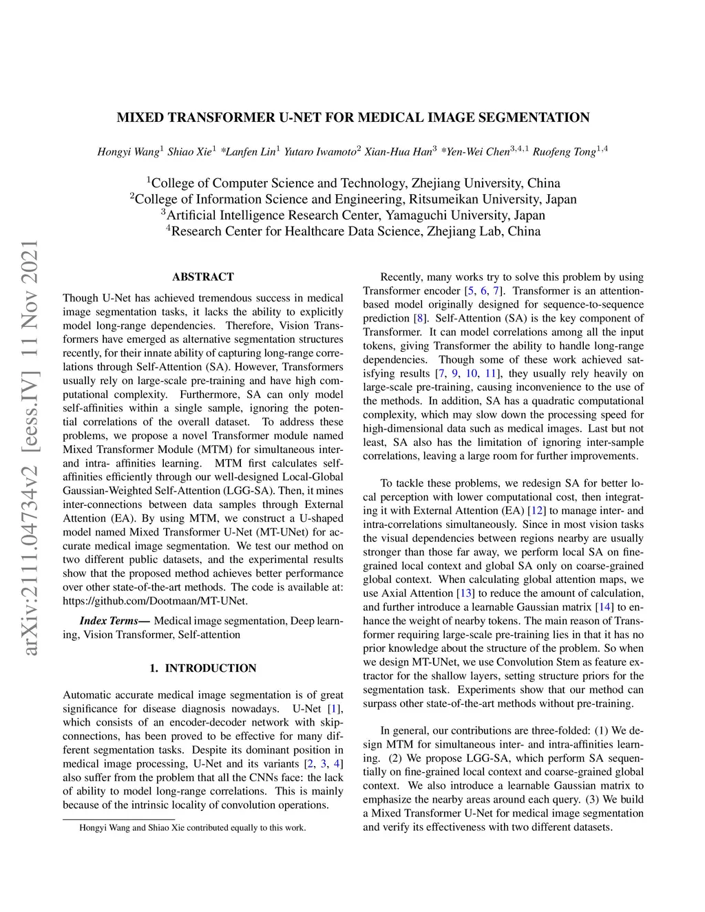Though U-Net has achieved tremendous success in medical image segmentation tasks, it lacks the ability to explicitly model long-range dependencies. Therefore, Vision Transformers have emerged as alternative segmentation structures recently, for their innate ability of capturing long-range correlations through Self-Attention (SA). However, Transformers usually rely on large-scale pre-training and have high computational complexity. Furthermore, SA can only model self-affinities within a single sample, ignoring the potential correlations of the overall dataset. To address these problems, we propose a novel Transformer module named Mixed Transformer Module (MTM) for simultaneous inter- and intra- affinities learning. MTM first calculates self-affinities efficiently through our well-designed Local-Global Gaussian-Weighted Self-Attention (LGG-SA). Then, it mines inter-connections between data samples through External Attention (EA). By using MTM, we construct a U-shaped model named Mixed Transformer U-Net (MT-UNet) for accurate medical image segmentation. We test our method on two different public datasets, and the experimental results show that the proposed method achieves better performance over other state-of-the-art methods. The code is available at: https://github.com/Dootmaan/MT-UNet.