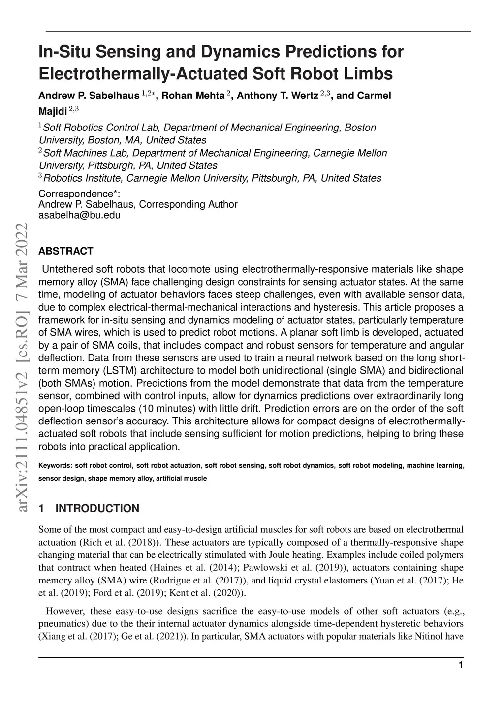 Untethered soft robots that locomote using electrothermally-responsive materials like shape memory alloy (SMA) face challenging design constraints for sensing actuator states. At the same time, modeling of actuator behaviors faces steep challenges, even with available sensor data, due to complex electrical-thermal-mechanical interactions and hysteresis. This article proposes a framework for in-situ sensing and dynamics modeling of actuator states, particularly temperature of SMA wires, which is used to predict robot motions. A planar soft limb is developed, actuated by a pair of SMA coils, that includes compact and robust sensors for temperature and angular deflection. Data from these sensors are used to train a neural network based on the long short-term memory (LSTM) architecture to model both unidirectional (single SMA) and bidirectional (both SMAs) motion. Predictions from the model demonstrate that data from the temperature sensor, combined with control inputs, allow for dynamics predictions over extraordinarily long open-loop timescales (10 minutes) with little drift. Prediction errors are on the order of the soft deflection sensor's accuracy. This architecture allows for compact designs of electrothermally-actuated soft robots that include sensing sufficient for motion predictions, helping to bring these robots into practical application.