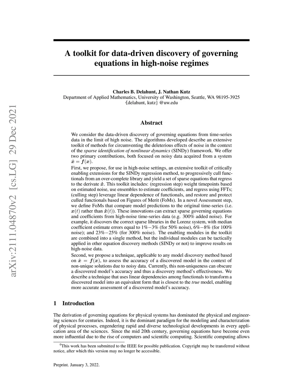 We consider the data-driven discovery of governing equations from time-series data in the limit of high noise. The algorithms developed describe an extensive toolkit of methods for circumventing the deleterious effects of noise in the context of the sparse identification of nonlinear dynamics (SINDy) framework. We offer two primary contributions, both focused on noisy data acquired from a system x' = f(x). First, we propose, for use in high-noise settings, an extensive toolkit of critically enabling extensions for the SINDy regression method, to progressively cull functionals from an over-complete library and yield a set of sparse equations that regress to the derivate x'. These innovations can extract sparse governing equations and coefficients from high-noise time-series data (e.g. 300% added noise). For example, it discovers the correct sparse libraries in the Lorenz system, with median coefficient estimate errors equal to 1% - 3% (for 50% noise), 6% - 8% (for 100% noise); and 23% - 25% (for 300% noise). The enabling modules in the toolkit are combined into a single method, but the individual modules can be tactically applied in other equation discovery methods (SINDy or not) to improve results on high-noise data. Second, we propose a technique, applicable to any model discovery method based on x' = f(x), to assess the accuracy of a discovered model in the context of non-unique solutions due to noisy data. Currently, this non-uniqueness can obscure a discovered model's accuracy and thus a discovery method's effectiveness. We describe a technique that uses linear dependencies among functionals to transform a discovered model into an equivalent form that is closest to the true model, enabling more accurate assessment of a discovered model's accuracy.